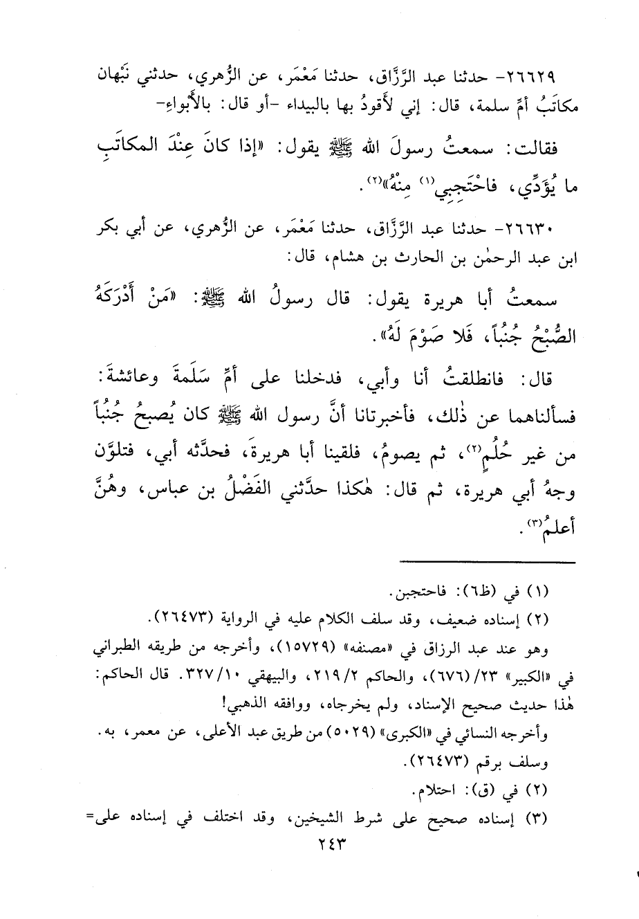 ٢٦٦٣٠ - حَدَّثَنَا عَبْدُ الرَّزَّاقِ، حَدَّثَنَا مَعْمَرٌ، عَنِ الزُّهْرِيِّ، عَنْ أَبِي بَكْرِ بْنِ عَبْدِ الرَّحْمَنِ بْنِ الْحَارِثِ بْنِ هِشَامٍ، قَالَ: سَمِعْتُ أَبَا هُرَيْرَةَ، يَقُولُ: قَالَ رَسُولُ اللهِ صَلَّى اللهُ عَلَيْهِ وَسَلَّمَ: " مَنْ أَدْرَكَهُ الصُّبْحُ جُنُبًا، فَلَا صَوْمَ لَهُ " قَالَ: فَانْطَلَقْتُ أَنَا وَأَبِي، فَدَخَلْنَا عَلَى أُمِّ سَلَمَةَ، وَعَائِشَةَ: فَسَأَلْنَاهُمَا عَنْ ذَلِكَ، فَأَخْبَرَتَانَا " أَنَّ رَسُولَ اللهِ صَلَّى اللهُ عَلَيْهِ وَسَلَّمَ كَانَ يُصْبِحُ جُنُبًا مِنْ غَيْرِ حُلُمٍ (٣) ، ثُمَّ يَصُومُ " فَلَقِينَا أَبَا هُرَيْرَةَ، فَحَدَّثَهُ أَبِي، فَتَلَوَّنَ وَجْهُ أَبِي هُرَيْرَةَ، ثُمَّ قَالَ: هَكَذَا حَدَّثَنِي الْفَضْلُ بْنُ عَبَّاسٍ، وَهُنَّ أَعْلَمُ (٤)