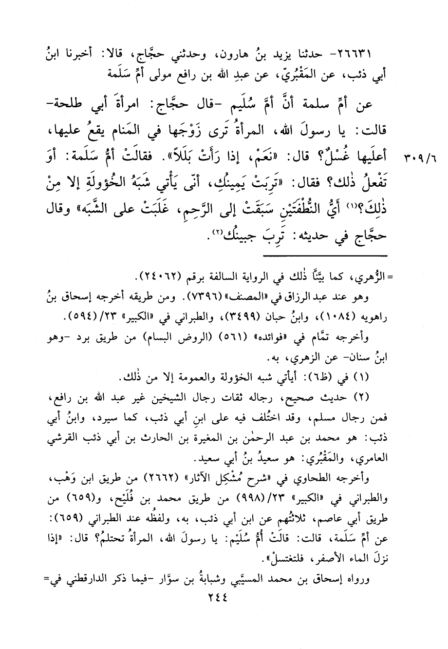 ٢٦٦٣١ - حَدَّثَنَا يَزِيدُ بْنُ هَارُونَ، وَحَدَّثَنِي حَجَّاجٌ، قَالَا: أَخْبَرَنَا ابْنُ أَبِي ذِئْبٍ، عَنِ الْمَقْبُرِيِّ، عَنْ عَبْدِ اللهِ بْنِ رَافِعٍ، مَوْلَى أُمِّ سَلَمَةَ، عَنْ أُمِّ سَلَمَةَ، أَنَّ أُمَّ سُلَيْمٍ، قَالَ حَجَّاجٌ: امْرَأَةَ أَبِي طَلْحَةَ، قَالَتْ: يَا رَسُولَ اللهِ، الْمَرْأَةُ تَرَى زَوْجَهَا فِي الْمَنَامِ يَقَعُ عَلَيْهَا، أَعَلَيْهَا غُسْلٌ؟ قَالَ: " نَعَمْ، إِذَا رَأَتْ بَلَلًا " فَقَالَتْ أُمُّ سَلَمَةَ: أَوَتَفْعَلُ ذَلِكَ؟ فَقَالَ: " تَرِبَتْ يَمِينُكِ، أَنَّى يَأْتِي شَبَهُ الْخُؤُولَةِ إِلَّا مِنْ ذَلِكِ؟ (١) أَيُّ النُّطْفَتَيْنِ سَبَقَتْ إِلَى الرَّحِمِ، غَلَبَتْ عَلَى الشَّبَهِ " وَقَالَ حَجَّاجٌ، فِي حَدِيثِهِ: تَرِبَ جَبِينُكِ (٢)