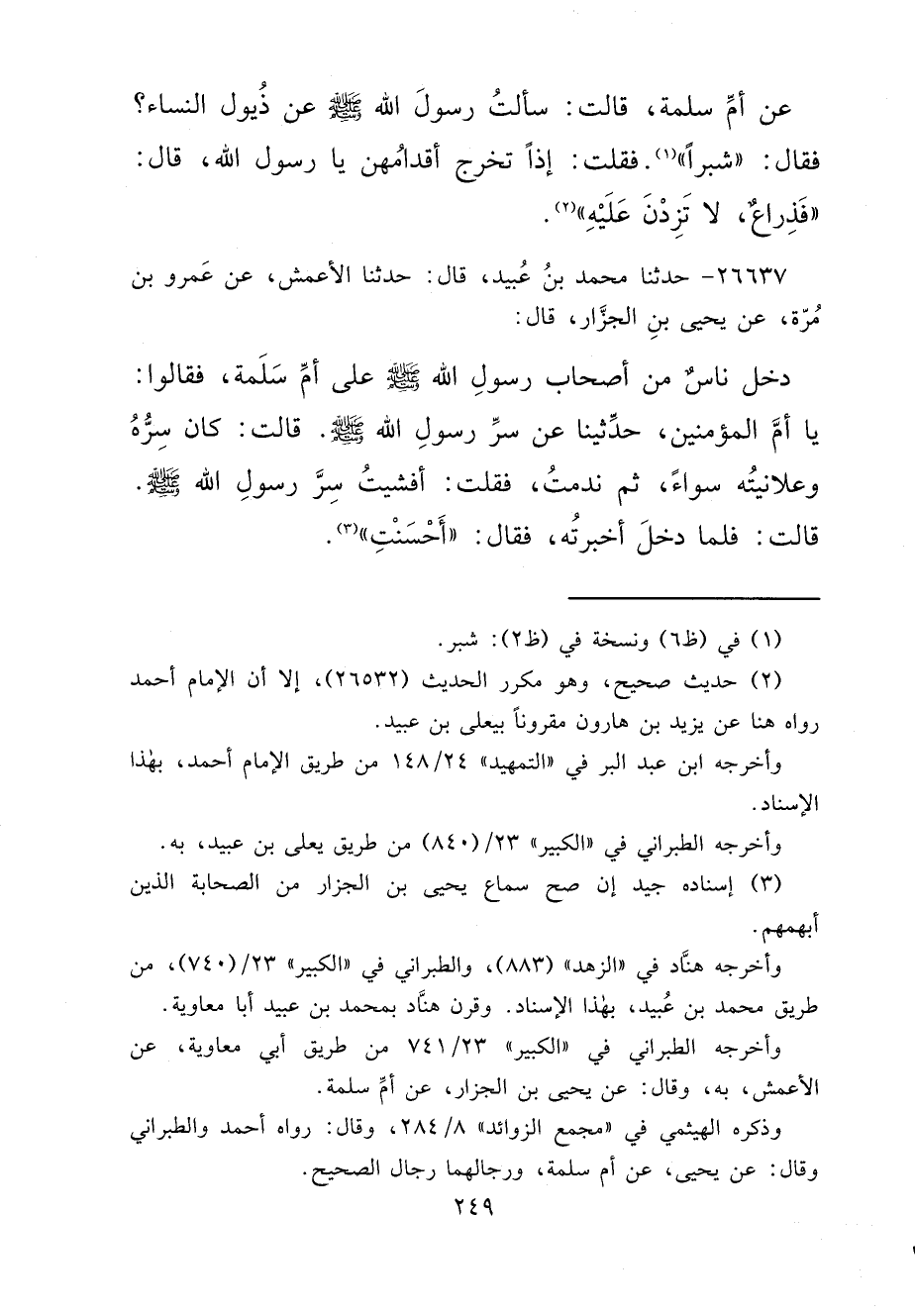 ٢٦٦٣٧ - حَدَّثَنَا مُحَمَّدُ بْنُ عُبَيْدٍ، قَالَ: حَدَّثَنَا الْأَعْمَشُ، عَنْ عَمْرِو بْنِ مُرَّةَ، عَنْ يَحْيَى بْنِ الْجَزَّارِ، قَالَ: دَخَلَ نَاسٌ مِنْ أَصْحَابِ رَسُولِ اللهِ صَلَّى اللهُ عَلَيْهِ وَسَلَّمَ عَلَى أُمِّ سَلَمَةَ، فَقَالُوا: يَا أُمَّ الْمُؤْمِنِينَ، حَدِّثِينَا عَنْ سِرِّ رَسُولِ اللهِ صَلَّى اللهُ عَلَيْهِ وَسَلَّمَ. قَالَتْ: كَانَ سِرُّهُ وَعَلَانِيَتُهُ سَوَاءً، ثُمَّ نَدِمْتُ، فَقُلْتُ: أَفْشَيْتُ سِرَّ رَسُولِ اللهِ صَلَّى اللهُ عَلَيْهِ وَسَلَّمَ. قَالَتْ: فَلَمَّا دَخَلَ أَخْبَرَتْهُ، فَقَالَ: " أَحْسَنْتِ " (٣)
