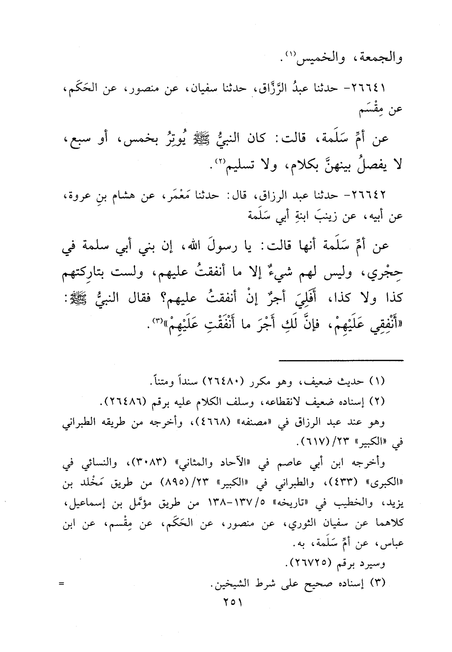 ٢٦٦٤١ - حَدَّثَنَا عَبْدُ الرَّزَّاقِ، حَدَّثَنَا سُفْيَانُ، عَنْ مَنْصُورٍ، عَنْ الْحَكَمِ، عَنْ مِقْسَمٍ، عَنْ أُمِّ سَلَمَةَ، قَالَتْ: " كَانَ النَّبِيُّ صَلَّى اللهُ عَلَيْهِ وَسَلَّمَ يُوتِرُ بِخَمْسٍ، أَوْ سَبْعٍ، لَا يَفْصِلُ بَيْنَهُنَّ بِكَلَامٍ، وَلَا تَسْلِيمٍ " (٢)