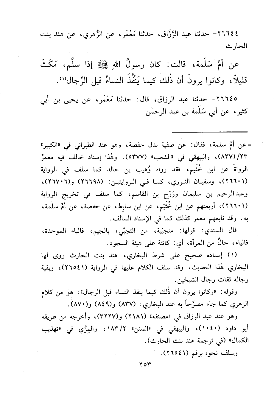 ٢٦٦٤٤ - حَدَّثَنَا عَبْدُ الرَّزَّاقِ، حَدَّثَنَا مَعْمَرٌ، عَنْ الزُّهْرِيِّ، عَنِ هِنْدِ بِنْتِ الْحَارِثِ، عَنْ أُمِّ سَلَمَةَ، قَالَتْ: " كَانَ رَسُولُ اللهِ صَلَّى اللهُ عَلَيْهِ وَسَلَّمَ إِذَا سَلَّمَ، مَكَثَ قَلِيلًا "، وَكَانُوا يَرَوْنَ أَنَّ ذَلِكَ كَيْمَا يَنْفُذُ النِّسَاءُ قَبْلَ الرِّجَالِ (١)