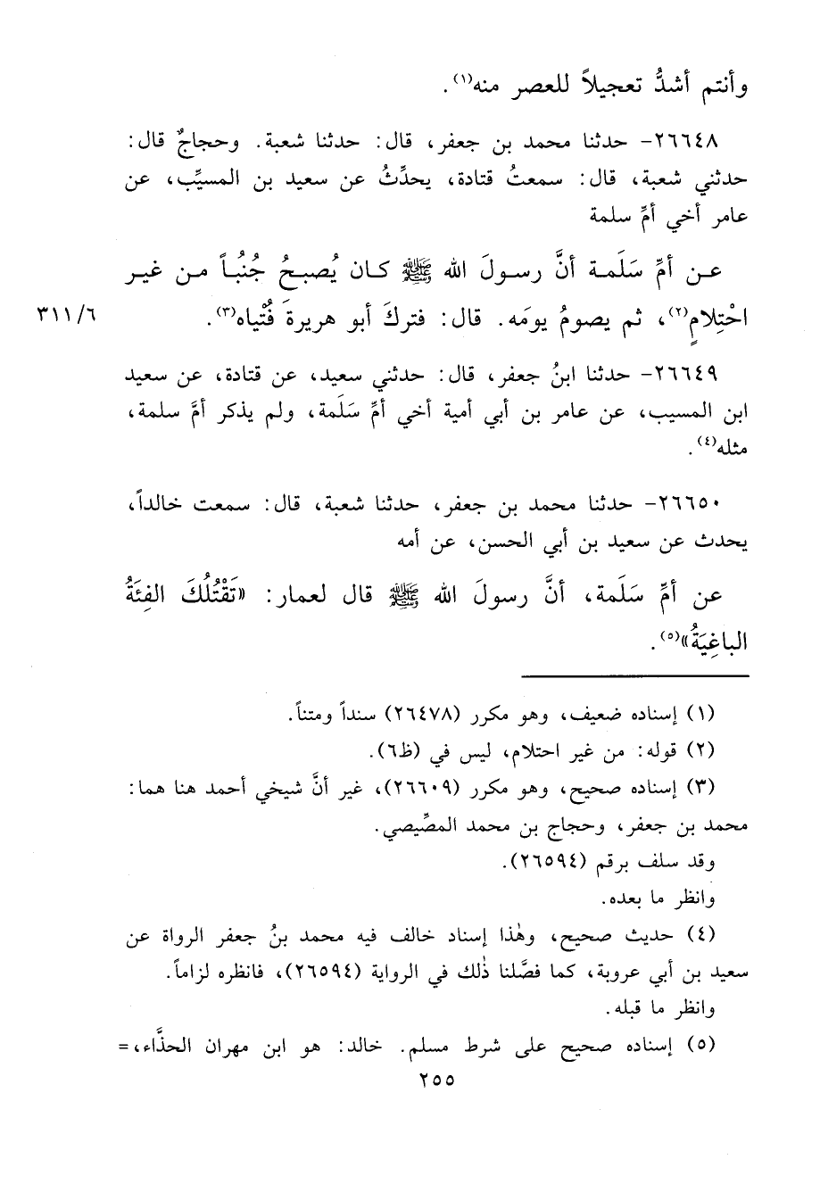 ٢٦٦٥٠ - حَدَّثَنَا مُحَمَّدُ بْنُ جَعْفَرٍ، حَدَّثَنَا شُعْبَةُ، قَالَ: سَمِعْتُ خَالِدًا، يُحَدِّثُ عَنْ سَعِيدِ بْنِ أَبِي الْحَسَنِ، عَنْ أُمِّهِ، عَنْ أُمِّ سَلَمَةَ، أَنَّ رَسُولَ اللهِ صَلَّى اللهُ عَلَيْهِ وَسَلَّمَ قَالَ لِعَمَّارٍ: " تَقْتُلُكَ الْفِئَةُ الْبَاغِيَةُ " (٥)