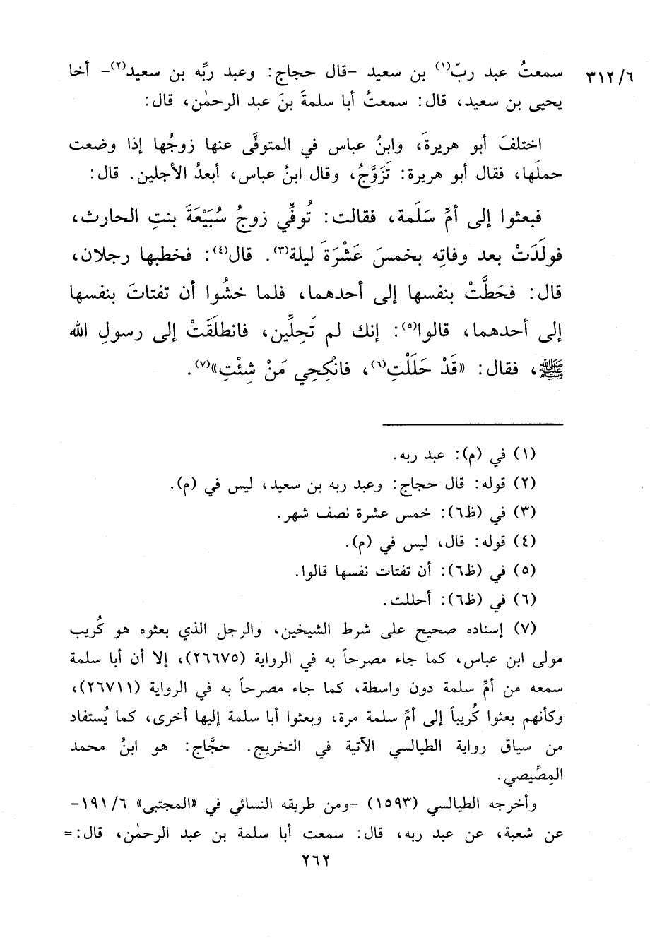 (٧) إسناده صحيح على شرط الشيخين، والرجل الذي بعثوه هو كُريب مولى ابن عباس، كما جاء مصرحاً به في الرواية (٢٦٦٧٥) ، إلا أن أبا سلمة سمعه من أمِّ سلمة دون واسطة، كما جاء مصرحاً به في الرواية (٢٦٧١١) ، وكأنهم بعثوا كُريباً إلى أمِّ سلمة مرة، وبعثوا أبا سلمة إليها اخرى، كما يُستفاد من سياق رواية الطيالسي الآتية في التخريج. حجِّاج: هو ابنُ محمد المِصِّيصي.