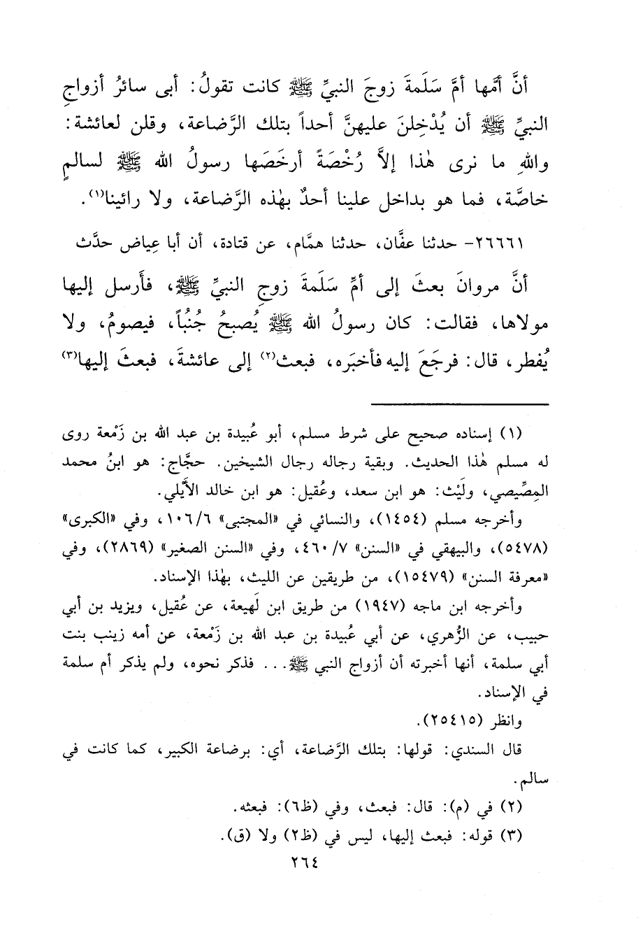 ٢٦٦٦١ - حَدَّثَنَا عَفَّانُ، حَدَّثَنَا هَمَّامٌ، عَنْ قَتَادَةَ، أَنَّ أَبَا عِيَاضٍ، حَدَّثَ أَنَّ مَرْوَانَ بَعَثَ إِلَى أُمِّ سَلَمَةَ، زَوْجِ النَّبِيِّ صَلَّى اللهُ عَلَيْهِ وَسَلَّمَ فَأَرْسَلَ إِلَيْهَا مَوْلَاهَا، فَقَالَتْ: " كَانَ رَسُولُ اللهِ صَلَّى اللهُ عَلَيْهِ وَسَلَّمَ يُصْبِحُ جُنُبًا، فَيَصُومُ، وَلَا يُفْطِرُ "، قَالَ: فَرَجَعَ إِلَيْهِ فَأَخْبَرَهُ، فَبَعَثَ (٢) إِلَى عَائِشَةَ، فَبَعَثَ إِلَيْهَا (٣)