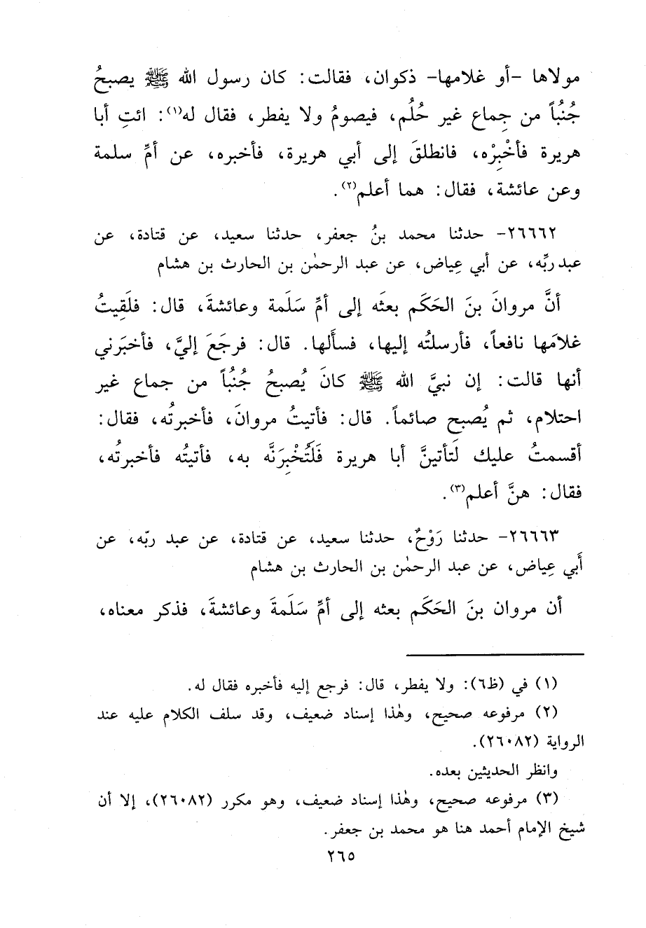 ٢٦٦٦٣ - حَدَّثَنَا رَوْحٌ، حَدَّثَنَا سَعِيدٌ، عَنْ قَتَادَةَ، عَنْ عَبْدِ رَبِّهِ، عَنْ أَبِي عِيَاضٍ، عَنْ عَبْدِ الرَّحْمَنِ بْنِ الْحَارِثِ بْنِ هِشَامٍ، أَنَّ مَرْوَانَ بْنَ الْحَكَمِ بَعَثَهُ إِلَى أُمِّ سَلَمَةَ، وَعَائِشَةَ، فَذَكَرَ مَعْنَاهُ،