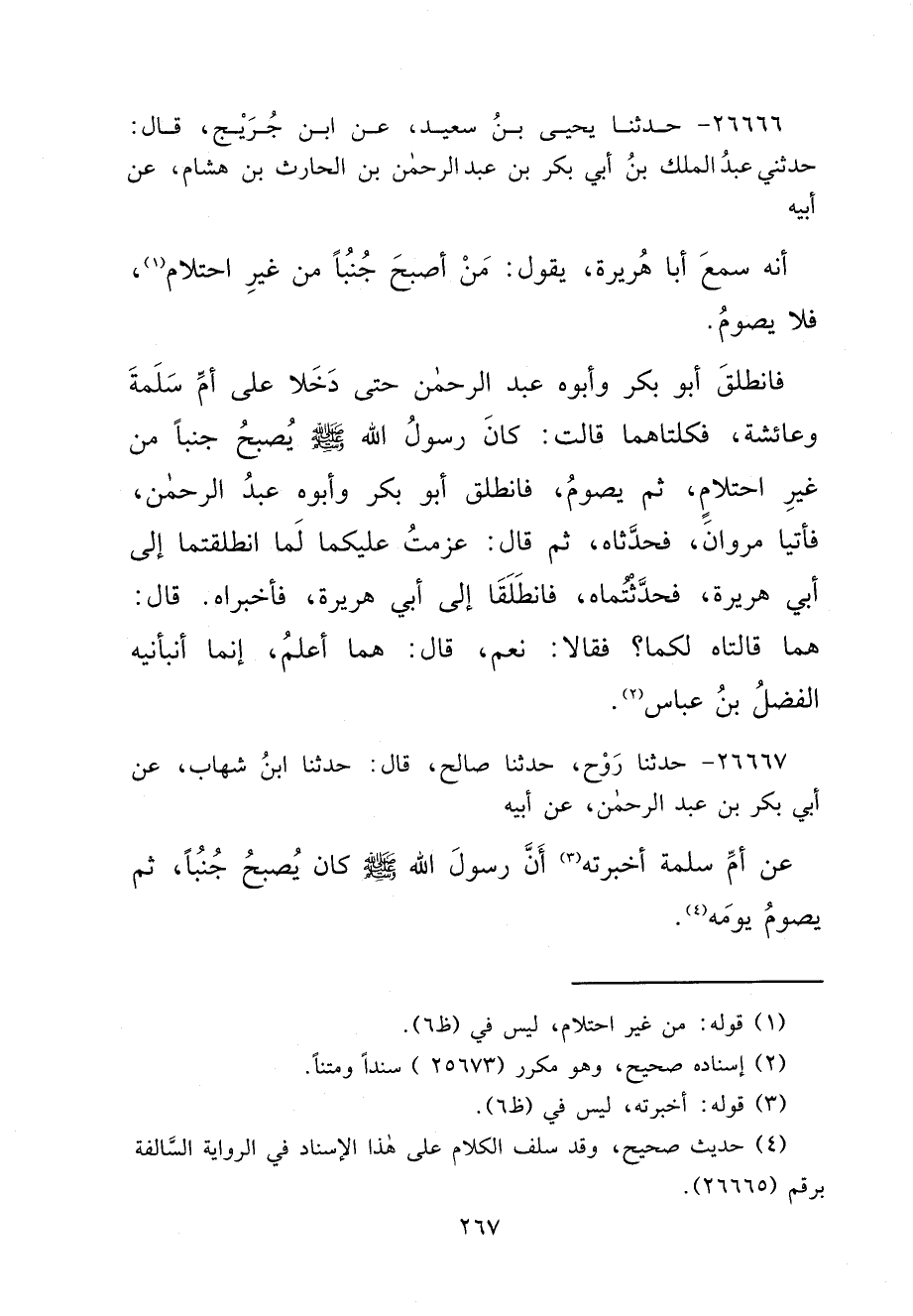 ٢٦٦٦٧ - حَدَّثَنَا رَوْحٌ، حَدَّثَنَا صَالِحٌ، قَالَ: حَدَّثَنَا ابْنُ شِهَابٍ، عَنْ أَبِي بَكْرِ بْنِ عَبْدِ الرَّحْمَنِ، عَنْ أَبِيهِ، عَنْ أُمِّ سَلَمَةَ، أَخْبَرَتْهُ " (٣) أَنَّ رَسُولَ اللهِ صَلَّى اللهُ عَلَيْهِ وَسَلَّمَ كَانَ يُصْبِحُ جُنُبًا، ثُمَّ يَصُومُ يَوْمَهُ " (٤)