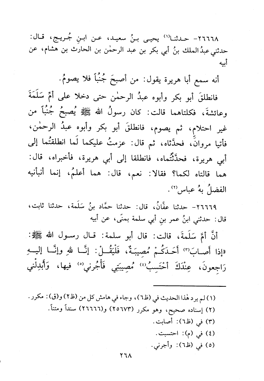 ٢٦٦٦٨ - حَدَّثَنَا (١) يَحْيَى بْنُ سَعِيدٍ، عَنِ ابْنِ جُرَيْجٍ، قَالَ: حَدَّثَنِي عَبْدُ الْمَلِكِ بْنُ أَبِي بَكْرِ بْنِ عَبْدِ الرَّحْمَنِ بْنِ الْحَارِثِ بْنِ هِشَامٍ، عَنْ أَبِيهِ، أَنَّهُ سَمِعَ أَبَا هُرَيْرَةَ يَقُولُ: " مَنْ أَصْبَحَ جُنُبًا فَلَا يَصُومُ " فَانْطَلَقَ أَبُو بَكْرٍ وَأَبُوهُ عَبْدُ الرَّحْمَنِ حَتَّى دَخَلَا عَلَى أُمِّ سَلَمَةَ، وَعَائِشَةَ، فَكِلْتَاهُمَا قَالَتْ: " كَانَ رَسُولُ اللهِ صَلَّى اللهُ عَلَيْهِ وَسَلَّمَ يُصْبِحُ جُنُبًا مِنْ غَيْرِ احْتِلَامٍ، ثُمَّ يَصُومُ "، فَانْطَلَقَ أَبُو بَكْرٍ، وَأَبُوهُ عَبْدُ الرَّحْمَنِ، فَأَتَيَا مَرْوَانَ، فَحَدَّثَاهُ، ثُمَّ قَالَ: عَزَمْتُ عَلَيْكُمَا لَمَا انْطَلَقْتُمَا إِلَى أَبِي هُرَيْرَةَ، فَحَدَّثْتُمَاهُ، فَانْطَلَقَا إِلَى أَبِي هُرَيْرَةَ فَأَخْبَرَاهُ، قَالَ: هُمَا قَالَتَاهُ لَكُمَا؟ فَقَالَا: نَعَمْ، قَالَ: هُمَا أَعْلَمُ، إِنَّمَا أَنَبَأَنِيهِ الْفَضْلُ بْنُ عَبَّاسٍ (٢)