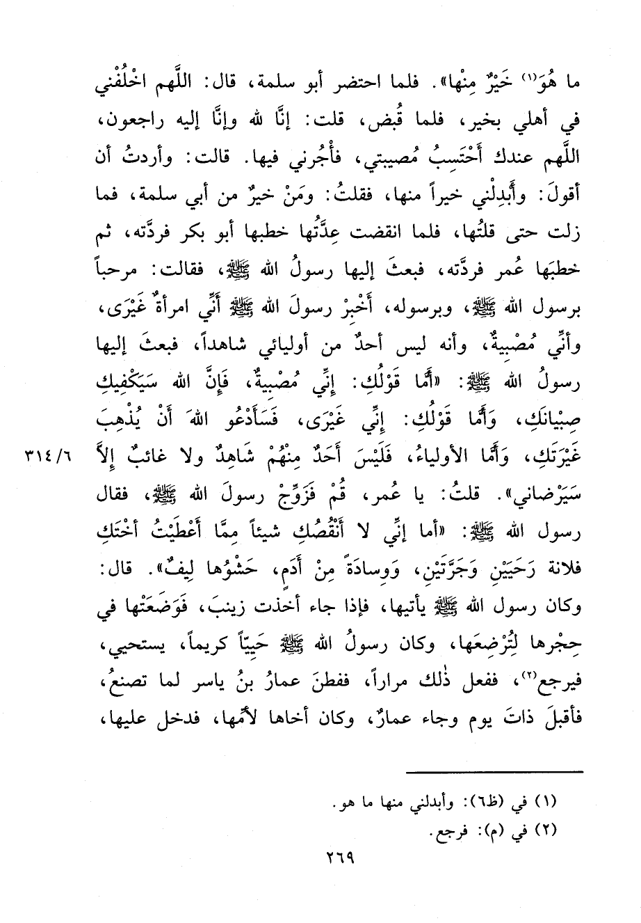 مَا هُوَ (١) خَيْرٌ مِنْهَا ". فَلَمَّا احْتُضِرَ أَبُو سَلَمَةَ، قَالَ: اللهُمَّ اخْلُفْنِي فِي أَهْلِي بِخَيْرٍ، فَلَمَّا قُبِضَ، قُلْتُ: إِنَّا لِلَّهِ وَإِنَّا إِلَيْهِ رَاجِعُونَ، اللهُمَّ عِنْدَكَ أَحْتَسِبُ مُصِيبَتِي، فَأْجُرْنِي فِيهَا. قَالَتْ: وَأَرَدْتُ أَنْ أَقُولَ: وَأَبْدِلْنِي خَيْرًا مِنْهَا، فَقُلْتُ: وَمَنْ خَيْرٌ مِنْ أَبِي سَلَمَةَ، فَمَا زِلْتُ حَتَّى قُلْتُهَا، فَلَمَّا انْقَضَتْ عِدَّتُهَا خَطَبَهَا أَبُو بَكْرٍ فَرَدَّتْهُ، ثُمَّ خَطَبَهَا عُمَرُ فَرَدَّتْهُ، فَبَعَثَ إِلَيْهَا رَسُولُ اللهِ صَلَّى اللهُ عَلَيْهِ وَسَلَّمَ، فَقَالَتْ: مَرْحَبًا بِرَسُولِ اللهِ صَلَّى اللهُ عَلَيْهِ وَسَلَّمَ، وَبِرَسُولِهِ، أَخْبِرْ رَسُولَ اللهِ صَلَّى اللهُ عَلَيْهِ وَسَلَّمَ أَنِّي امْرَأَةٌ غَيْرَى، وَأَنِّي مُصْبِيَةٌ، وَأَنَّهُ لَيْسَ أَحَدٌ مِنْ أَوْلِيَائِي شَاهِدًا، فَبَعَثَ إِلَيْهَا رَسُولُ اللهِ صَلَّى اللهُ عَلَيْهِ وَسَلَّمَ: " أَمَّا قَوْلُكِ: إِنِّي مُصْبِيَةٌ، فَإِنَّ اللهَ سَيَكْفِيكِ صِبْيَانَكِ، وَأَمَّا قَوْلُكِ: إِنِّي غَيْرَى، فَسَأَدْعُو اللهَ أَنْ يُذْهِبَ غَيْرَتَكِ، وَأَمَّا الْأَوْلِيَاءُ، فَلَيْسَ أَحَدٌ مِنْهُمْ شَاهِدٌ وَلَا غَائِبٌ إِلَّا سَيَرْضَانِي ". قُلْتُ: يَا عُمَرُ، قُمْ فَزَوِّجْ رَسُولَ اللهِ صَلَّى اللهُ عَلَيْهِ وَسَلَّمَ، فَقَالَ رَسُولُ اللهِ صَلَّى اللهُ عَلَيْهِ وَسَلَّمَ: " أَمَا إِنِّي لَا أَنْقُصُكِ شَيْئًا مِمَّا أَعْطَيْتُ أُخْتَكِ فُلَانَةَ رَحَيَيْنِ وَجَرَّتَيْنِ، وَوِسَادَةً مِنْ أَدَمٍ، حَشْوُهَا لِيفٌ ". قَالَ: وَكَانَ رَسُولُ اللهِ صَلَّى اللهُ عَلَيْهِ وَسَلَّمَ يَأْتِيهَا، فَإِذَا جَاءَ أَخَذَتْ زَيْنَبَ، فَوَضَعَتْهَا فِي حِجْرِهَا لِتُرْضِعَهَا، وَكَانَ رَسُولُ اللهِ صَلَّى اللهُ عَلَيْهِ وَسَلَّمَ حَيِيًّا كَرِيمًا، يَسْتَحْيِي، فَيَرْجِعُ (٢) ، فَفَعَلَ ذَلِكَ مِرَارًا، فَفَطِنَ عَمَّارُ بْنُ يَاسِرٍ لِمَا تَصْنَعُ، فَأَقْبَلَ ذَاتَ يَوْمٍ وَجَاءَ عَمَّارٌ، وَكَانَ أَخَاهَا لِأُمِّهَا، فَدَخَلَ عَلَيْهَا،