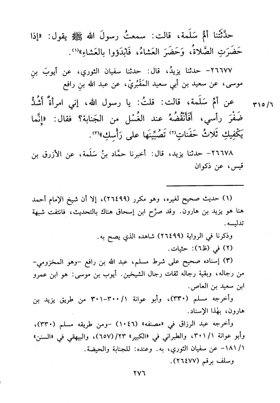 ٢٦٦٧٧ - حَدَّثَنَا يَزِيدُ، قَالَ: حَدَّثَنَا سُفْيَانُ الثَّوْرِيُّ، عَنْ أَيُّوبَ بْنِ مُوسَى، عَنْ سَعِيدِ بْنِ أَبِي سَعِيدٍ الْمَقْبُرِيِّ، عَنْ عَبْدِ اللهِ بْنِ رَافِعٍ، عَنْ أُمِّ سَلَمَةَ، قَالَتْ: قُلْتُ: يَا رَسُولَ اللهِ، إِنِّي امْرَأَةٌ أَشُدُّ ضَفْرَ رَأْسِي، أَفَأَنْقُضُهُ عِنْدَ الْغُسْلِ مِنَ الْجَنَابَةِ؟ فَقَالَ: " إِنَّمَا يَكْفِيكِ ثَلَاثُ حَفَنَاتٍ (٢) تَصُبِّينَهَا عَلَى رَأْسِكِ " (٣)