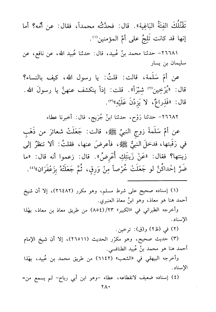 ٢٦٦٨٢ - حَدَّثَنَا رَوْحٌ، حَدَّثَنَا ابْنُ جُرَيْجٍ، قَالَ: أَخْبَرَنَا عَطَاءٌ، عَنْ أُمِّ سَلَمَةَ، زَوْجِ النَّبِيِّ صَلَّى اللهُ عَلَيْهِ وَسَلَّمَ، قَالَتْ: جَعَلَتْ شَعَائِرَ مِنْ ذَهَبٍ فِي رَقَبَتِهَا، فَدَخَلَ النَّبِيُّ صَلَّى اللهُ عَلَيْهِ وَسَلَّمَ، فَأَعْرَضَ عَنْهَا، فَقُلْتُ: أَلَا تَنْظُرُ إِلَى زِينَتِهَا؟ فَقَالَ: " عَنْ زِينَتِكِ أُعْرِضُ ". قَالَ: زَعَمُوا أَنَّهُ قَالَ: " مَا ضَرَّ إِحْدَاكُنَّ لَوْ جَعَلَتْ خُرْصًا مِنْ وَرِقٍ، ثُمَّ جَعَلَتْهُ بِزَعْفَرَانٍ " (٤)