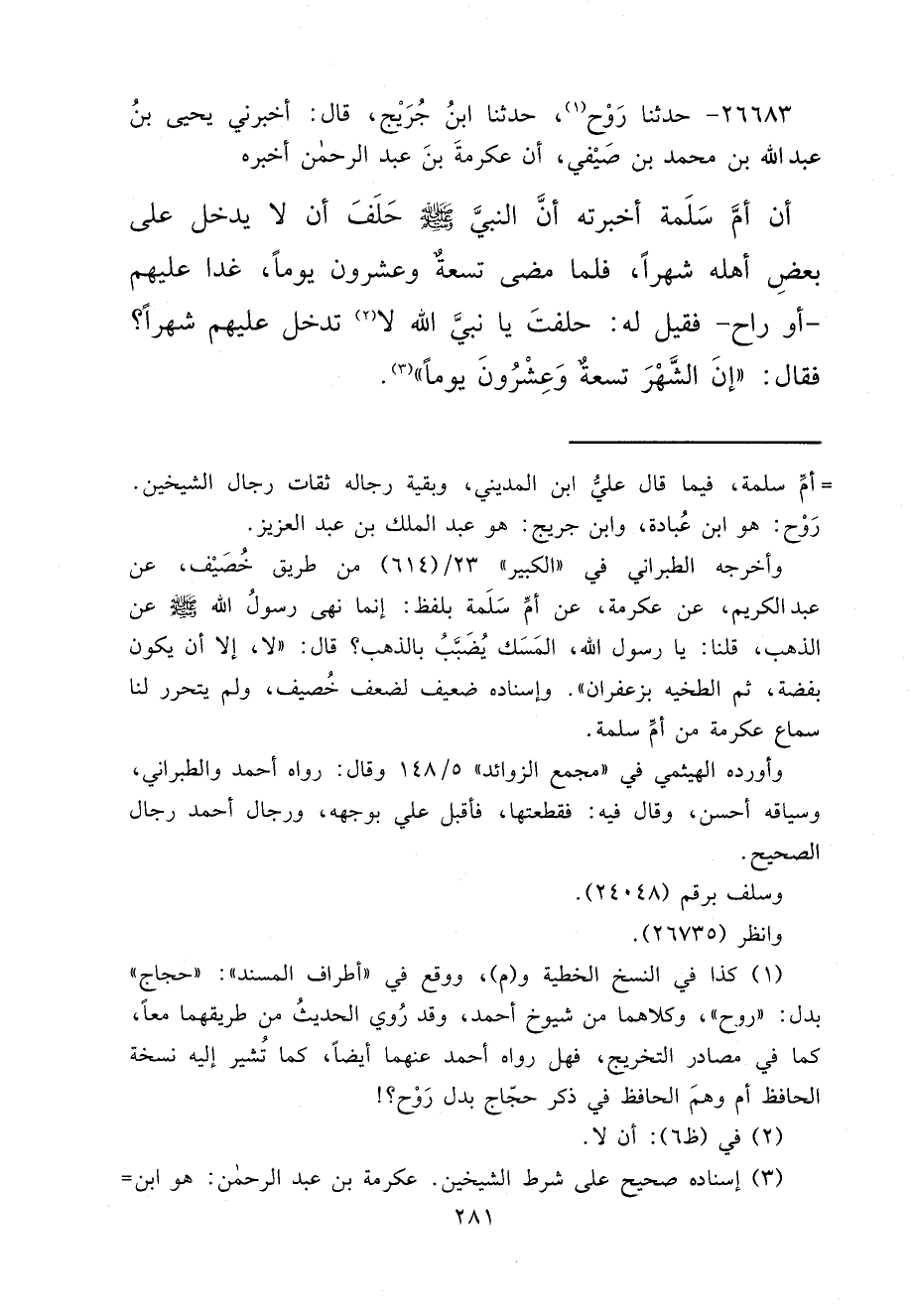 ٢٦٦٨٣ - حَدَّثَنَا رَوْحٌ (١) ، حَدَّثَنَا ابْنُ جُرَيْجٍ، قَالَ: أَخْبَرَنِي يَحْيَى بْنُ عَبْدِ اللهِ بْنِ مُحَمَّدِ بْنِ صَيْفِيٍّ، أَنَّ عِكْرِمَةَ بْنَ عَبْدِ الرَّحْمَنِ، أَخْبَرَهُ أَنَّ أُمَّ سَلَمَةَ، أَخْبَرْتُهُ أَنَّ النَّبِيَّ صَلَّى اللهُ عَلَيْهِ وَسَلَّمَ حَلَفَ أَنْ لَا يَدْخُلَ عَلَى بَعْضِ أَهْلِهِ شَهْرًا، فَلَمَّا مَضَى تِسْعَةٌ وَعِشْرُونَ يَوْمًا، غَدَا عَلَيْهِمْ، أَوْ رَاحَ، فَقِيلَ لَهُ: حَلَفْتَ يَا نَبِيَّ اللهِ لَا (٢) تَدْخُلُ عَلَيْهِمْ شَهْرًا؟ فَقَالَ: " إِنَّ الشَّهْرَ تِسْعَةٌ وَعِشْرُونَ يَوْمًا " (٣)