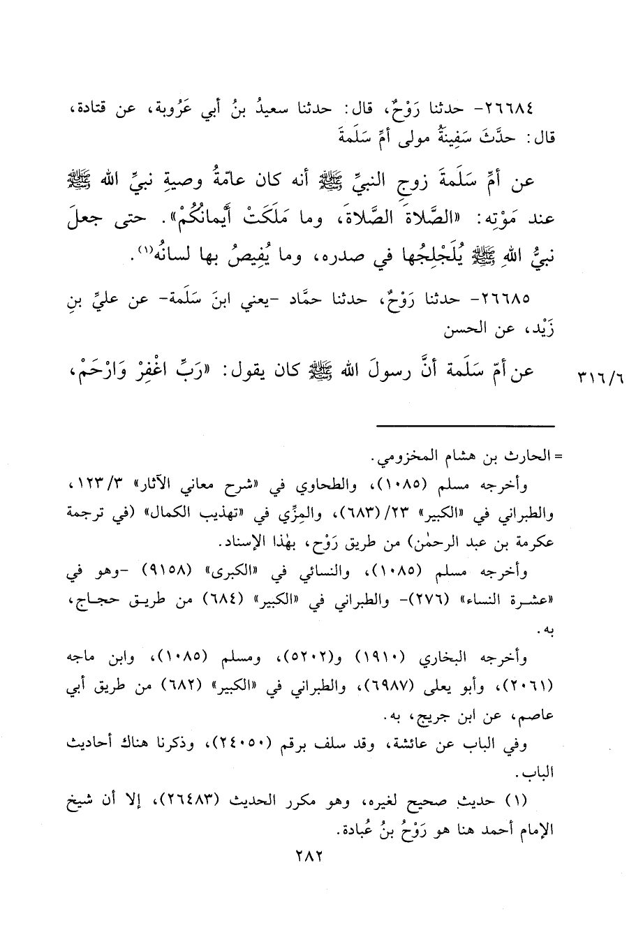 ٢٦٦٨٤ - حَدَّثَنَا رَوْحٌ، قَالَ: حَدَّثَنَا سَعِيدُ بْنُ أَبِي عَرُوبَةَ، عَنْ قَتَادَةَ، قَالَ: حَدَّثَ سَفِينَةُ، مَوْلَى أُمِّ سَلَمَةَ، عَنْ أُمِّ سَلَمَةَ، زَوْجِ النَّبِيِّ صَلَّى اللهُ عَلَيْهِ وَسَلَّمَ أَنَّهُ كَانَ عَامَّةُ وَصِيَّةِ نَبِيِّ اللهِ صَلَّى اللهُ عَلَيْهِ وَسَلَّمَ عِنْدَ مَوْتِهِ: " الصَّلَاةَ الصَّلَاةَ، وَمَا مَلَكَتْ أَيْمَانُكُمْ ". حَتَّى جَعَلَ نَبِيُّ اللهِ صَلَّى اللهُ عَلَيْهِ وَسَلَّمَ يُلَجْلِجُهَا فِي صَدْرِهِ، وَمَا يَفِيضُ بِهَا لِسَانُهُ (١)