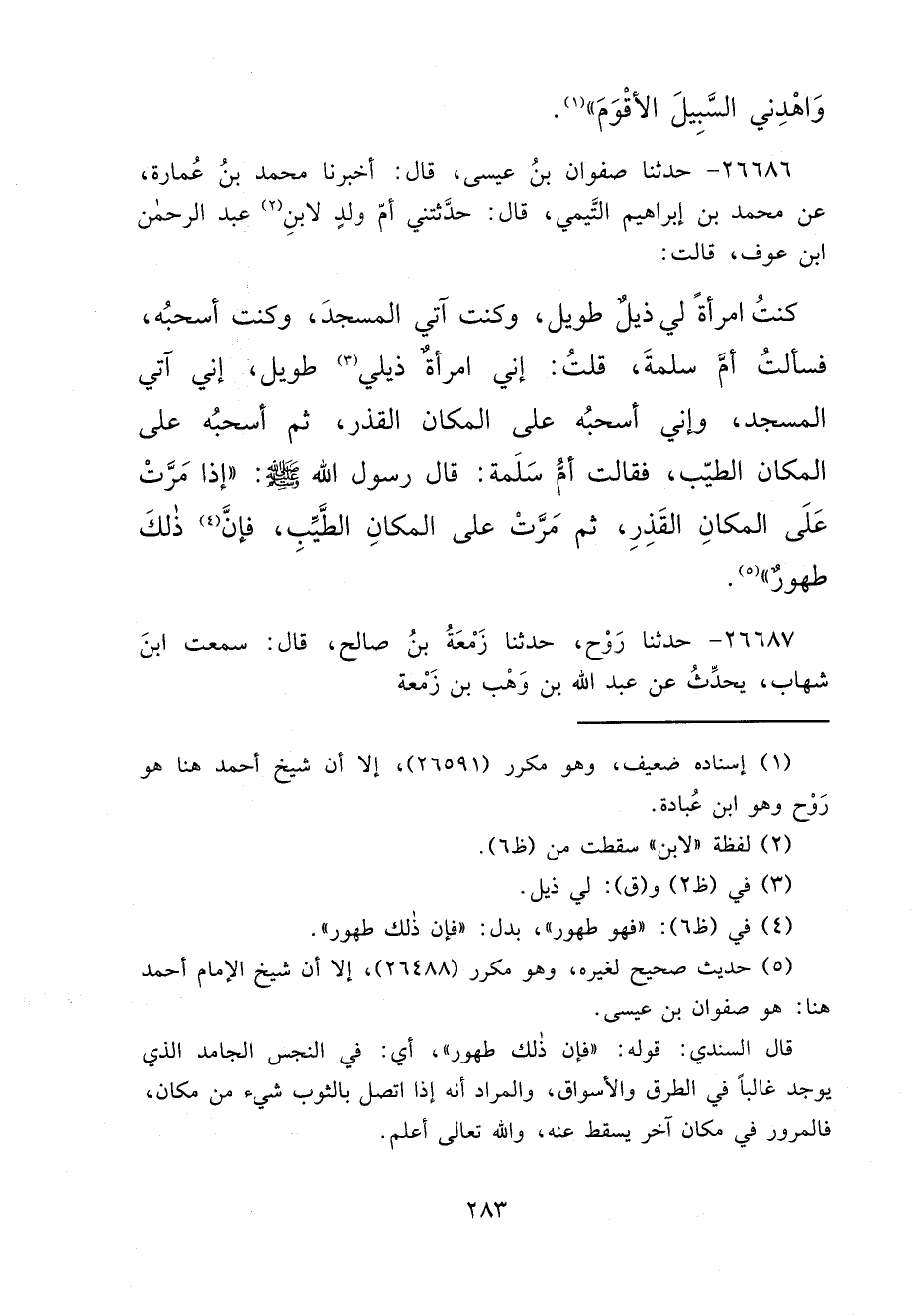 ٢٦٦٨٦ - حَدَّثَنَا صَفْوَانُ بْنُ عِيسَى، قَالَ: أَخْبَرَنَا مُحَمَّدُ بْنُ عُمَارَةَ، عَنْ مُحَمَّدِ بْنِ إِبْرَاهِيمَ التَّيْمِيِّ، قَالَ: حَدَّثَتْنِي أُمُّ وَلَدٍ لِابْنِ (٢) عَبْدِ الرَّحْمَنِ بْنِ عَوْفٍ، قَالَتْ: كُنْتُ امْرَأَةً لِي ذَيْلٌ طَوِيلٌ، وَكُنْتُ آتِي الْمَسْجِدَ، وَكُنْتُ أَسْحَبُهُ، فَسَأَلْتُ أُمَّ سَلَمَةَ، قُلْتُ: إِنِّي امْرَأَةٌ ذَيْلِي (٣) طَوِيلٌ، وَإِنِّي آتِي الْمَسْجِدَ، وَإِنِّي أَسْحَبُهُ عَلَى الْمَكَانِ الْقَذِرِ، ثُمَّ أَسْحَبُهُ عَلَى الْمَكَانِ الطَّيِّبِ، فَقَالَتْ أُمُّ سَلَمَةَ: قَالَ رَسُولُ اللهِ صَلَّى اللهُ عَلَيْهِ وَسَلَّمَ: " إِذَا مَرَّتْ عَلَى الْمَكَانِ الْقَذِرِ، ثُمَّ مَرَّتْ عَلَى الْمَكَانِ الطَّيِّبِ، فَإِنَّ (٤) ذَلِكَ طَهُورٌ " (٥)
