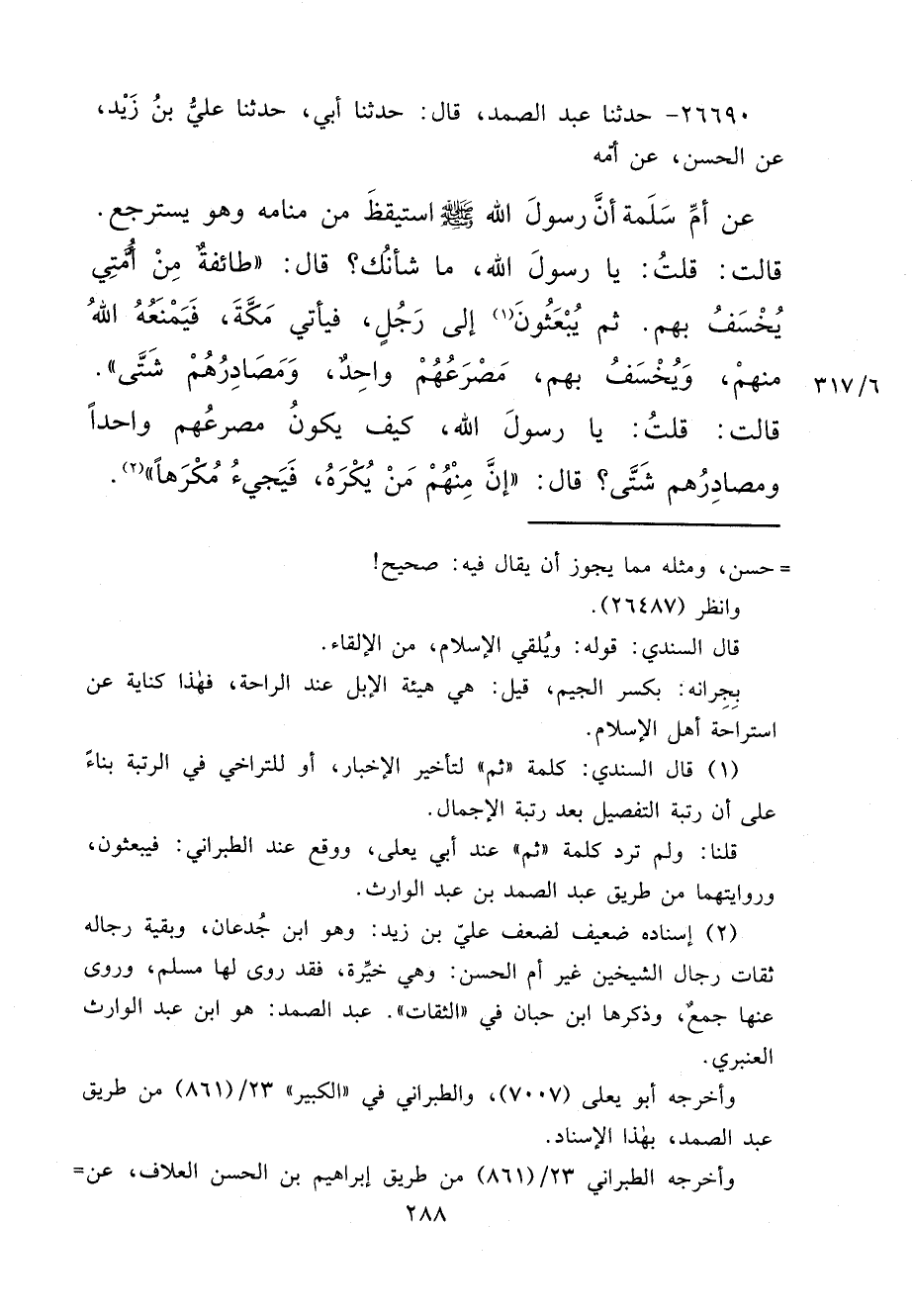 ٢٦٦٩٠ - حَدَّثَنَا عَبْدُ الصَّمَدِ، قَالَ: حَدَّثَنَا أَبِي، حَدَّثَنَا عَلِيُّ بْنُ زَيْدٍ، عَنْ الْحَسَنِ، عَنْ أُمِّهِ، عَنْ أُمِّ سَلَمَةَ، أَنَّ رَسُولَ اللهِ صَلَّى اللهُ عَلَيْهِ وَسَلَّمَ اسْتَيْقَظَ مِنْ مَنَامِهِ وَهُوَ يَسْتَرْجِعُ. قَالَتْ: قُلْتُ: يَا رَسُولَ اللهِ، مَا شَأْنُكَ؟ قَالَ: " طَائِفَةٌ مِنْ أُمَّتِي يُخْسَفُ بِهِمْ. ثُمَّ يُبْعَثُونَ (١) إِلَى رَجُلٍ، فَيَأْتِي مَكَّةَ، فَيَمْنَعُهُ اللهُ مِنْهُمْ، وَيُخْسَفُ بِهِمْ، مَصْرَعُهُمْ وَاحِدٌ، وَمَصَادِرُهُمْ شَتَّى " قَالَتْ: قُلْتُ: يَا رَسُولَ اللهِ، كَيْفَ يَكُونُ مَصْرَعُهُمْ وَاحِدًا، وَمَصَادِرُهُمْ شَتَّى؟ قَالَ: " إِنَّ مِنْهُمْ مَنْ يُكْرَهُ، فَيَجِيءُ مُكْرَهًا " (٢)