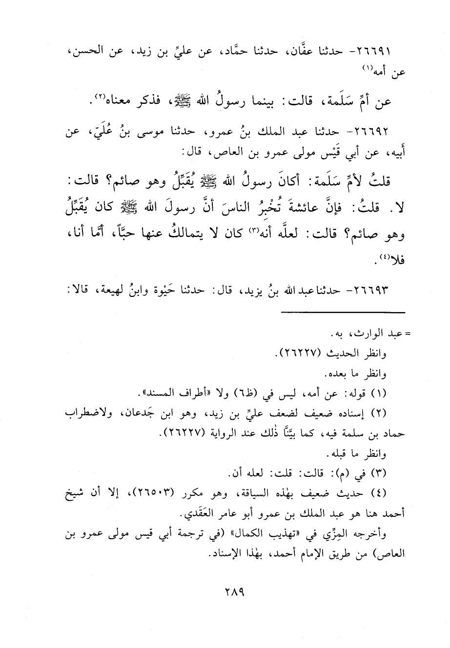 ٢٦٦٩٢ - حَدَّثَنَا عَبْدُ الْمَلِكِ بْنُ عَمْرٍو، حَدَّثَنَا مُوسَى بْنُ عَلِيٍّ، عَنْ أَبِيهِ، عَنْ أَبِي قَيْسٍ، مَوْلَى عَمْرِو بْنِ الْعَاصِ، قَالَ: قُلْتُ لِأُمِّ سَلَمَةَ: أَكَانَ رَسُولُ اللهِ صَلَّى اللهُ عَلَيْهِ وَسَلَّمَ يُقَبِّلُ وَهُوَ صَائِمٌ؟ قَالَتْ: لَا. قُلْتُ: فَإِنَّ عَائِشَةَ، تُخْبِرُ النَّاسَ " أَنَّ رَسُولَ اللهِ صَلَّى اللهُ عَلَيْهِ وَسَلَّمَ كَانَ يُقَبِّلُ وَهُوَ صَائِمٌ؟ " قَالَتْ: قُلْتُ: لَعَلَّهُ أَنَّهُ (٣) كَانَ لَا يَتَمَالَكُ عَنْهَا حُبًّا، أَمَّا أَنَا فَلَا (٤)