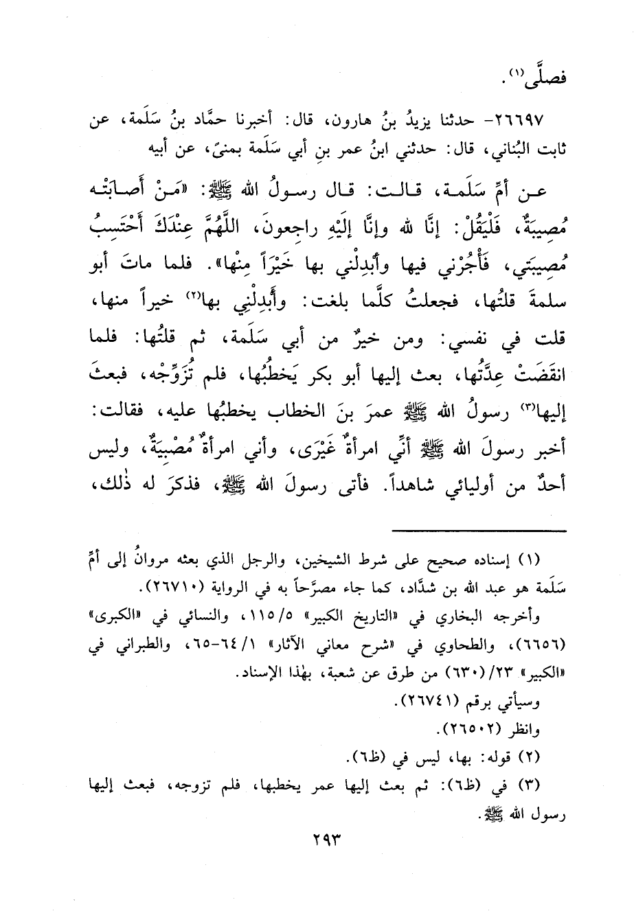 ٢٦٦٩٧ - حَدَّثَنَا يَزِيدُ بْنُ هَارُونَ، قَالَ: أَخْبَرَنَا حَمَّادُ بْنُ سَلَمَةَ، عَنْ ثَابِتٍ الْبُنَانِيِّ، قَالَ: حَدَّثَنِي ابْنُ عُمَرَ بْنِ أَبِي سَلَمَةَ، بِمِنًى، عَنْ أَبِيهِ، عَنْ أُمِّ سَلَمَةَ، قَالَتْ: قَالَ رَسُولُ اللهِ صَلَّى اللهُ عَلَيْهِ وَسَلَّمَ: " مَنْ أَصَابَتْهُ مُصِيبَةٌ، فَلْيَقُلْ: إِنَّا لِلَّهِ وَإِنَّا إِلَيْهِ رَاجِعُونَ، اللهُمَّ عِنْدَكَ أَحْتَسِبُ مُصِيبَتِي، فَأْجُرْنِي فِيهَا وَأَبْدِلْنِي بِهَا (٢) خَيْرًا مِنْهَا ". فَلَمَّا مَاتَ أَبُو سَلَمَةَ قُلْتُهَا، فَجَعَلْتُ كُلَّمَا بَلَغْتُ: وَأَبْدِلْنِي بِهَا خَيْرًا مِنْهَا، قُلْتُ فِي نَفْسِي: وَمَنْ خَيْرٌ مِنْ أَبِي سَلَمَةَ، ثُمَّ قُلْتُهَا: فَلَمَّا انْقَضَتْ عِدَّتُهَا، بَعَثَ إِلَيْهَا أَبُو بَكْرٍ يَخْطُبُهَا، فَلَمْ تَزَوَّجْهُ، فَبَعَثَ إِلَيْهَا (٣) رَسُولُ اللهِ صَلَّى اللهُ عَلَيْهِ وَسَلَّمَ عُمَرَ بْنَ الْخَطَّابِ يَخْطُبُهَا عَلَيْهِ، فَقَالَتْ: أَخْبِرْ رَسُولَ اللهِ صَلَّى اللهُ عَلَيْهِ وَسَلَّمَ أَنِّي امْرَأَةٌ غَيْرَى، وَأَنِّي امْرَأَةٌ مُصْبِيَةٌ، وَلَيْسَ أَحَدٌ مِنْ أَوْلِيَائِي شَاهِدًا. فَأَتَى رَسُولَ اللهِ صَلَّى اللهُ عَلَيْهِ وَسَلَّمَ، فَذَكَرَ لَهُ ذَلِكَ،