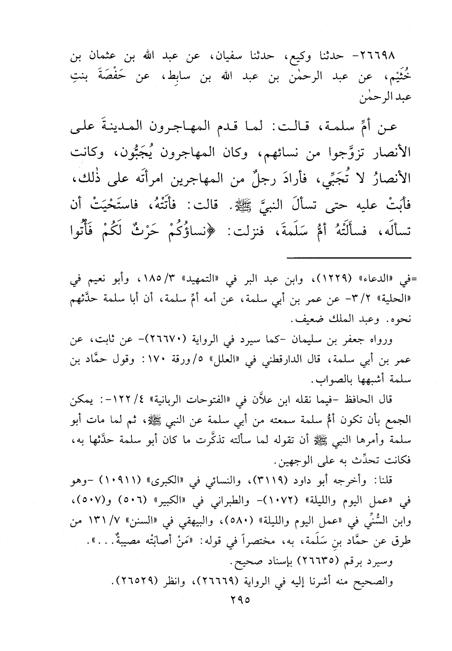 ٢٦٦٩٨ - حَدَّثَنَا وَكِيعٌ، حَدَّثَنَا سُفْيَانُ، عَنْ عَبْدِ اللهِ بْنِ عُثْمَانَ بْنِ خُثَيْمٍ، عَنْ عَبْدِ الرَّحْمَنِ بْنِ عَبْدِ اللهِ بْنِ سَابِطٍ، عَنْ حَفْصَةَ بِنْتِ عَبْدِ الرَّحْمَنِ، عَنْ أُمِّ سَلَمَةَ، قَالَتْ: لَمَّا قَدِمَ الْمُهَاجِرُونَ الْمَدِينَةَ عَلَى الْأَنْصَارِ تَزَوَّجُوا مِنْ نِسَائِهِمْ، وَكَانَ الْمُهَاجِرُونَ يُجَبُّونَ، وَكَانَتِ الْأَنْصَارُ لَا تُجَبِّي، فَأَرَادَ رَجُلٌ مِنَ الْمُهَاجِرِينَ امْرَأَتَهُ عَلَى ذَلِكَ، فَأَبَتْ عَلَيْهِ حَتَّى تَسْأَلَ النَّبِيَّ صَلَّى اللهُ عَلَيْهِ وَسَلَّمَ، قَالَتْ: فَأَتَتْهُ، فَاسْتَحْيَتْ أَنْ تَسْأَلَهُ، فَسَأَلَتْهُ أُمُّ سَلَمَةَ، فَنَزَلَتْ: {نِسَاؤُكُمْ حَرْثٌ لَكُمْ فَأْتُوا