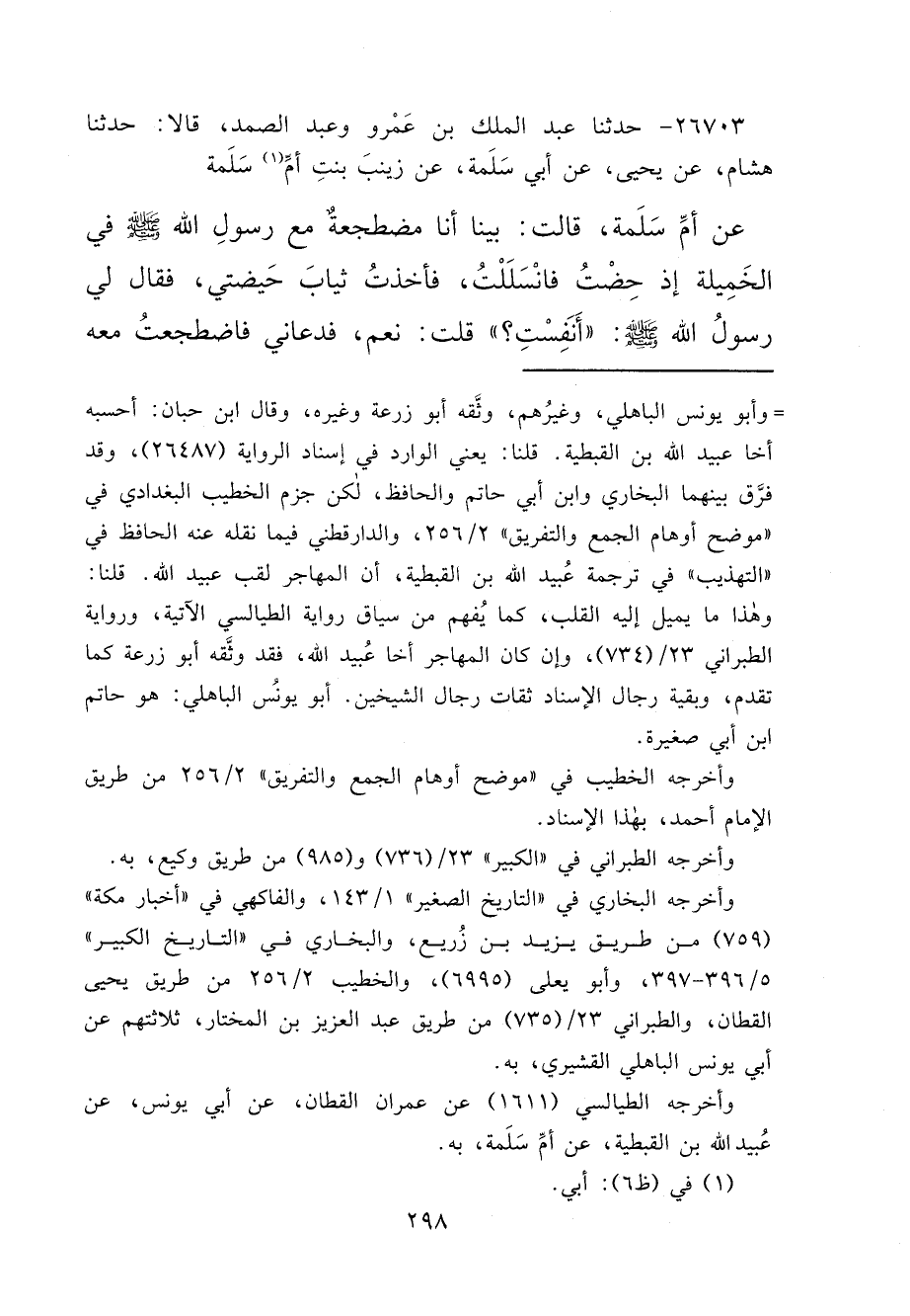 وهذا ما يميل إليه القلب، كما يُفهم من سياق رواية الطيالسي الآتية، ورواية الطبراني ٢٣/ (٧٣٤) ، وإن كان المهاجر أخا عُبيد الله، فقد وثَّقه أبو زرعة كما تقدم، وبقية رجال الإسناد ثقات رجال الشيخين. أبو يونُس الباهلي: هو حاتم ابن أبي صغيرة.