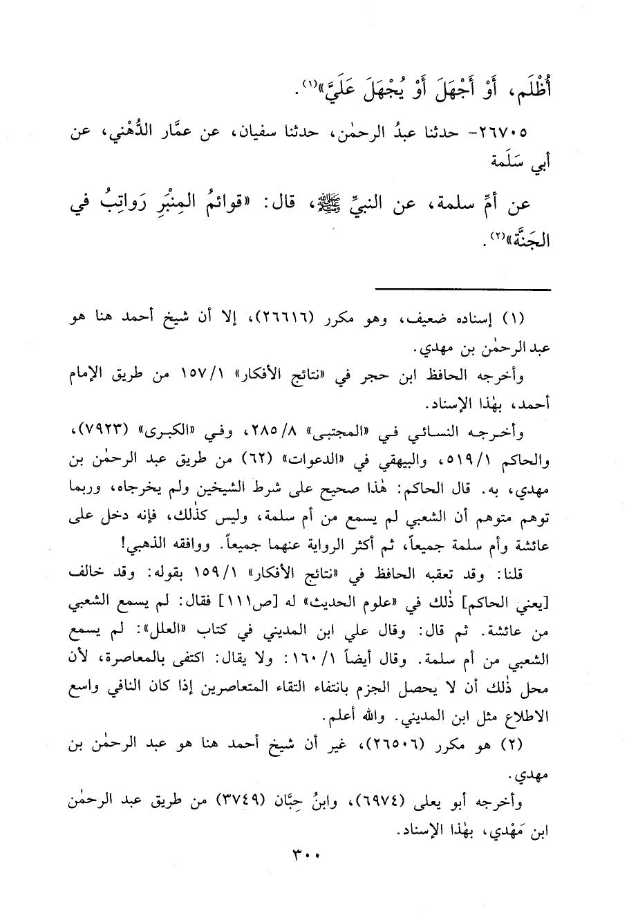 ٢٦٧٠٥ - حَدَّثَنَا عَبْدُ الرَّحْمَنِ، حَدَّثَنَا سُفْيَانُ، عَنْ عَمَّارٍ الدُّهْنِيِّ، عَنْ أَبِي سَلَمَةَ، عَنْ أُمِّ سَلَمَةَ، عَنِ النَّبِيِّ صَلَّى اللهُ عَلَيْهِ وَسَلَّمَ قَالَ: " قَوَائِمُ الْمِنْبَرِ رَوَاتِبُ فِي الْجَنَّةِ " (٢)