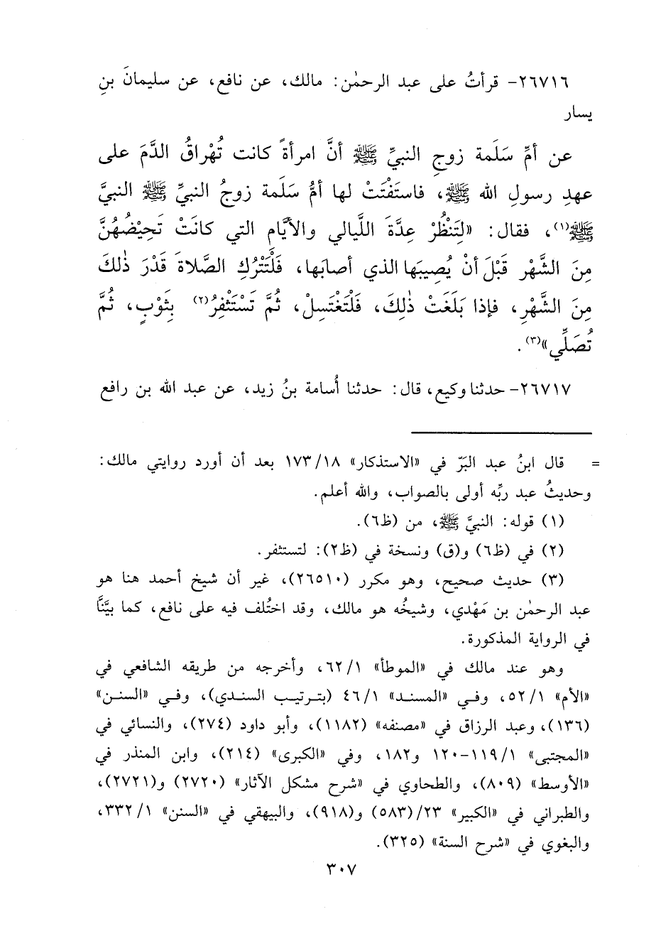 ٢٦٧١٦ - قَرَأْتُ عَلَى عَبْدِ الرَّحْمَنِ: مَالِكٌ، عَنْ نَافِعٍ، عَنْ سُلَيْمَانَ بْنِ يَسَارٍ، عَنْ أُمِّ سَلَمَةَ، زَوْجِ النَّبِيِّ صَلَّى اللهُ عَلَيْهِ وَسَلَّمَ أَنَّ امْرَأَةً كَانَتْ تُهَرَاقُ الدَّمَ عَلَى عَهْدِ رَسُولِ اللهِ صَلَّى اللهُ عَلَيْهِ وَسَلَّمَ، فَاسْتَفْتَتْ لَهَا أُمُّ سَلَمَةَ زَوْجُ النَّبِيِّ صَلَّى اللهُ عَلَيْهِ وَسَلَّمَ، النَّبِيَّ صَلَّى اللهُ عَلَيْهِ وَسَلَّمَ (١) فَقَالَ: " لِتَنْظُرْ عِدَّةَ اللَّيَالِي وَالْأَيَّامِ الَّتِي كَانَتْ تَحِيضُهُنَّ مِنَ الشَّهْرِ قَبْلَ أَنْ يُصِيبَهَا الَّذِي أَصَابَهَا، فَلْتَتْرُكِ الصَّلَاةَ قَدْرَ ذَلِكَ مِنَ الشَّهْرِ، فَإِذَا بَلَغَتْ ذَلِكَ، فَلْتَغْتَسِلْ، ثُمَّ تَسْتَثْفِرْ (٢) بِثَوْبٍ، ثُمَّ تُصَلِّي " (٣)