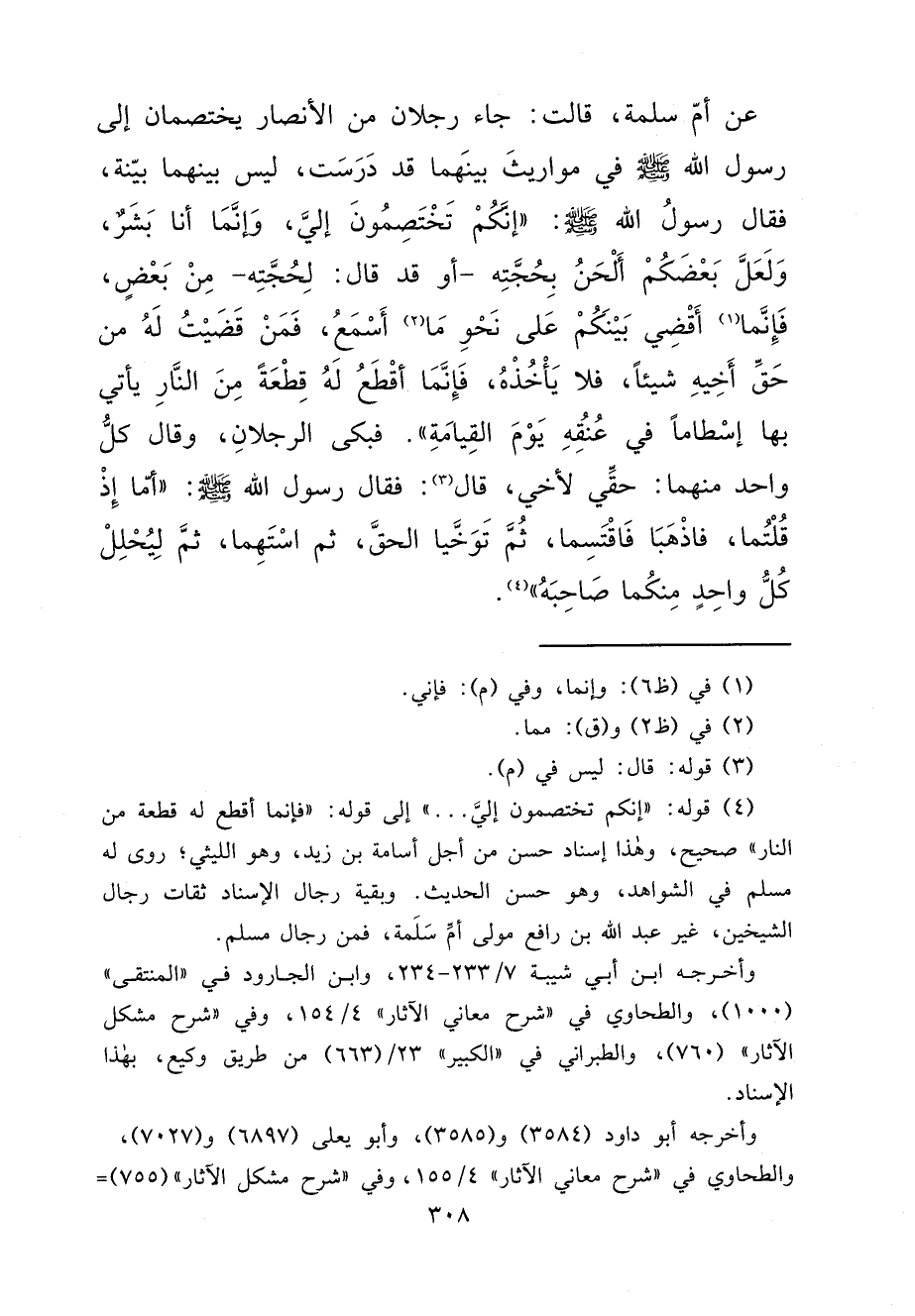 (٤) قوله: "إنكم تختصمون إليَّ ... " إلى قوله: "فإنما أقطع له قطعة من النار" صحيح، وهذا إسناد حسن من أجل أسامة بن زيد، وهو الليثي؛ روى له مسلم في الشواهد، وهو حسن الحديث. وبقية رجال الإسناد ثقات رجال الشيخين، غير عبد الله بن رافع مولى أمِّ سَلَمة، فمن رجال مسلم.