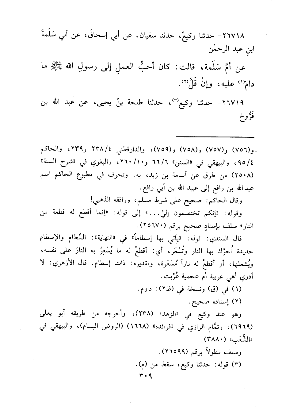 ٢٦٧١٨ - حَدَّثَنَا وَكِيعٌ، حَدَّثَنَا سُفْيَانُ، عَنْ أَبِي إِسْحَاقَ، عَنْ أَبِي سَلَمَةَ بْنِ عَبْدِ الرَّحْمَنِ، عَنْ أُمِّ سَلَمَةَ، قَالَتْ: " كَانَ أَحَبُّ الْعَمَلِ إِلَى رَسُولِ اللهِ صَلَّى اللهُ عَلَيْهِ وَسَلَّمَ مَا دَامَ (١) عَلَيْهِ، وَإِنْ قَلَّ " (٢)