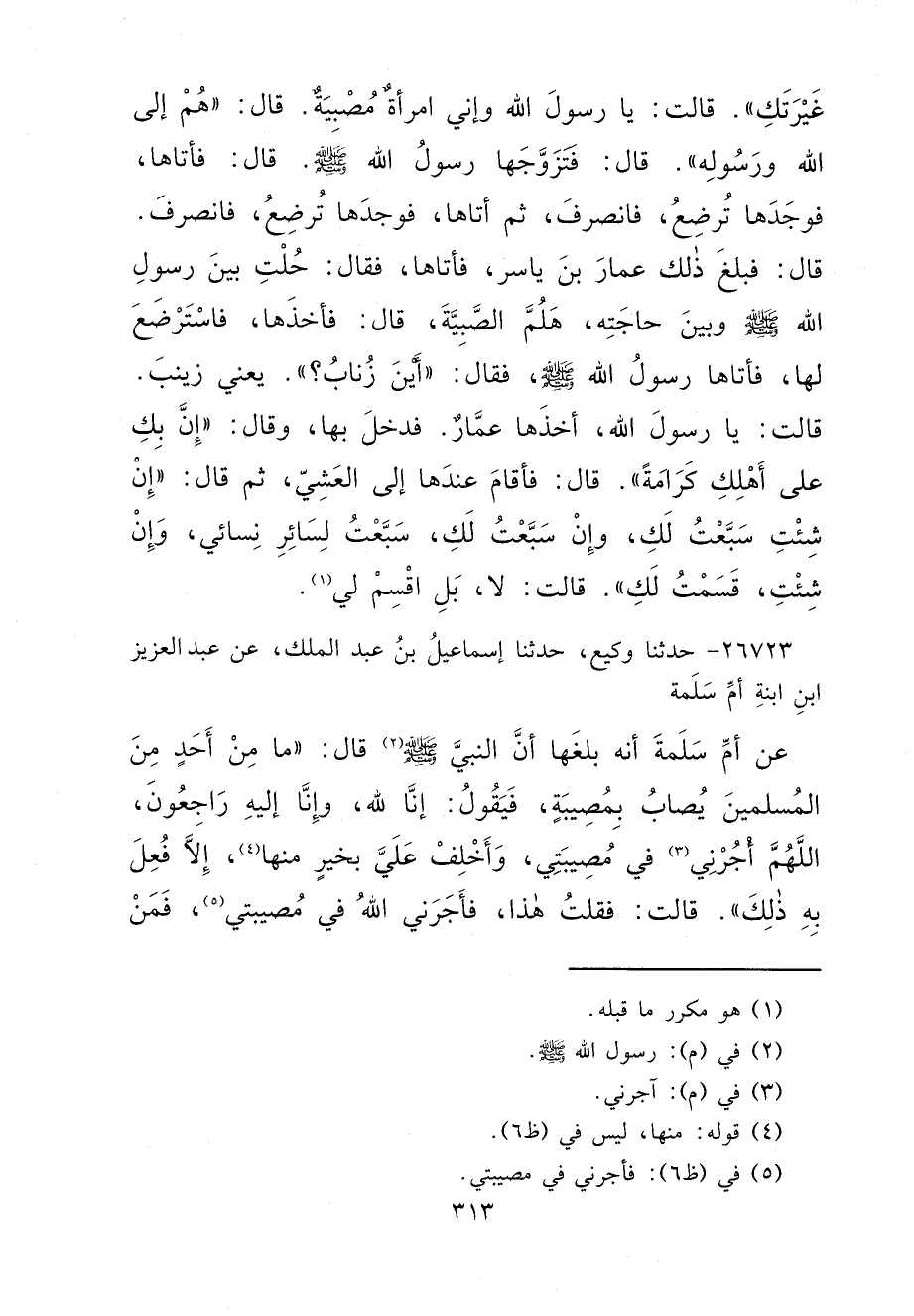 ٢٦٧٢٣ - حَدَّثَنَا وَكِيعٌ، حَدَّثَنَا إِسْمَاعِيلُ بْنُ عَبْدِ الْمَلِكِ، عَنْ عَبْدِ الْعَزِيزِ ابْنِ ابْنَةِ أُمِّ سَلَمَةَ، عَنْ أُمِّ سَلَمَةَ، أَنَّهُ بَلَغَهَا أَنَّ النَّبِيِّ صَلَّى اللهُ عَلَيْهِ وَسَلَّمَ (٢) قَالَ: " مَا مِنْ أَحَدٍ مِنَ الْمُسْلِمِينَ يُصَابُ بِمُصِيبَةٍ، فَيَقُولُ: إِنَّا لِلَّهِ، وَإِنَّا إِلَيْهِ رَاجِعُونَ، اللهُمَّ أْجُرْنِي (٣) فِي مُصِيبَتِي، وَاخْلُفْ عَلَيَّ بِخَيْرٍ مِنْهَا (٤) ، إِلَّا فُعِلَ بِهِ ذَلِكَ ". قَالَتْ: فَقُلْتُ هَذَا، فَأَجَرَنِي اللهُ فِي مُصِيبَتِي (٥) ، فَمَنْ