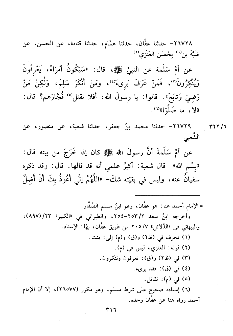 ٢٦٧٢٨ - حَدَّثَنَا عَفَّانُ، حَدَّثَنَا هَمَّامٌ، حَدَّثَنَا قَتَادَةُ، عَنْ الْحَسَنِ، عَنْ ضَبَّةَ بْنِ (١) مُحْصِنٍ الْعَنْزِيَّ (٢) ، عَنْ أُمِّ سَلَمَةَ، عَنِ النَّبِيِّ صَلَّى اللهُ عَلَيْهِ وَسَلَّمَ، قَالَ: " سَيَكُونُ أُمَرَاءُ، يَعْرِفُونَ وَيُنْكِرُونَ (٣) ، فَمَنْ عَرَفَ بَرِئَ (٤) ، وَمَنْ أَنْكَرَ سَلِمَ، وَلَكِنْ مَنْ رَضِيَ وَتَابَعَ ". قَالُوا: يَا رَسُولَ اللهِ، أَفَلَا نَقَتُلُ (٥) فُجَّارَهُمْ؟ قَالَ: " لَا، مَا صَلَّوْا " (٦)