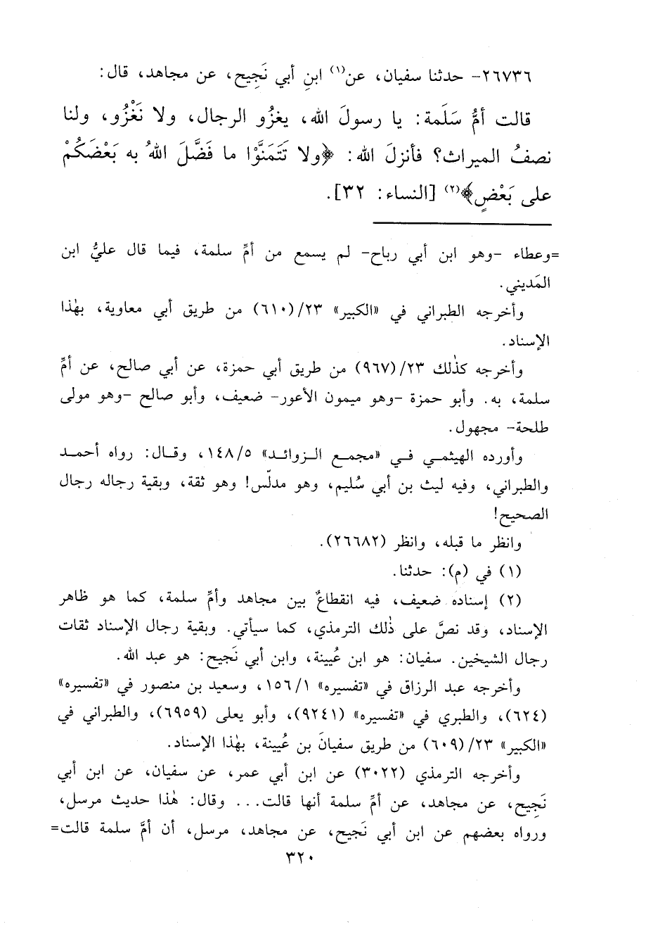 ٢٦٧٣٦ - حَدَّثَنَا سُفْيَانُ، عَنْ (١) ابْنُ أَبِي نَجِيحٍ، عَنْ مُجَاهِدٍ، قَالَ: قَالَتْ أُمُّ سَلَمَةَ: " يَا رَسُولَ اللهِ، يَغْزُو الرِّجَالُ، وَلَا نَغْزُو، وَلَنَا نِصْفُ الْمِيرَاثِ؟ فَأَنْزَلَ اللهُ: {وَلَا تَتَمَنَّوْا مَا فَضَّلَ اللهُ بِهِ بَعْضَكُمْ عَلَى بَعْضٍ} (٢) [النساء: ٣٢] "