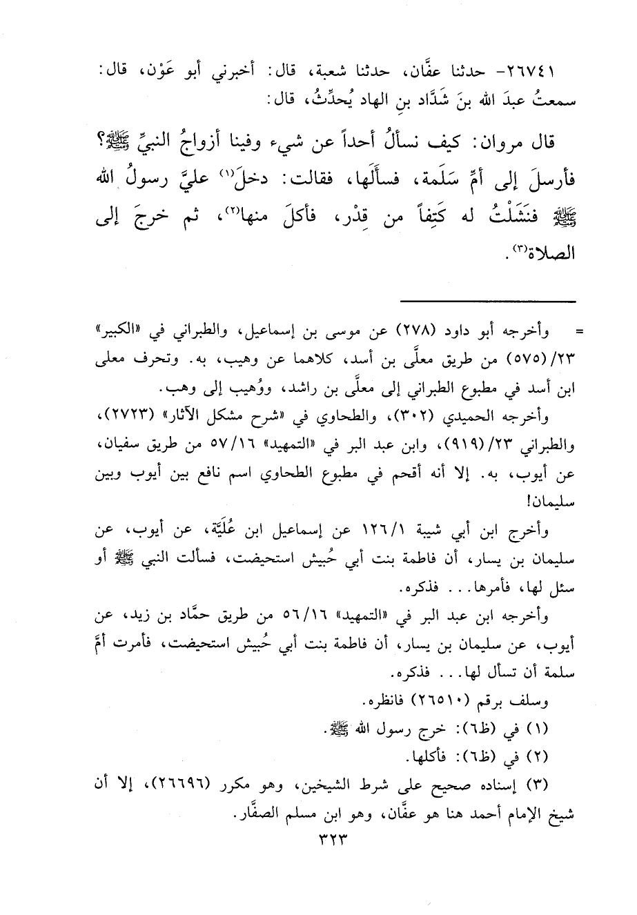 ٢٦٧٤١ - حَدَّثَنَا عَفَّانُ، حَدَّثَنَا شُعْبَةُ، قَالَ: أَخْبَرَنِي أَبُو عَوْنٍ، قَالَ: سَمِعْتُ عَبْدَ اللهِ بْنَ شَدَّادِ بْنِ الْهَادِ، يُحَدِّثُ، قَالَ: قَالَ مَرْوَانُ: كَيْفَ نَسْأَلُ أَحَدًا عَنْ شَيْءٍ وَفِينَا أَزْوَاجُ النَّبِيِّ صَلَّى اللهُ عَلَيْهِ وَسَلَّمَ؟ فَأَرْسَلَ إِلَى أُمِّ سَلَمَةَ، فَسَأَلَهَا، فَقَالَتْ: " دَخَلَ (١) عَلَيَّ رَسُولُ اللهِ صَلَّى اللهُ عَلَيْهِ وَسَلَّمَ فَنَشَلْتُ لَهُ كَتِفًا مِنْ قِدْرٍ، فَأَكَلَ مِنْهَا (٢) ، ثُمَّ خَرَجَ إِلَى الصَّلَاةِ " (٣)
