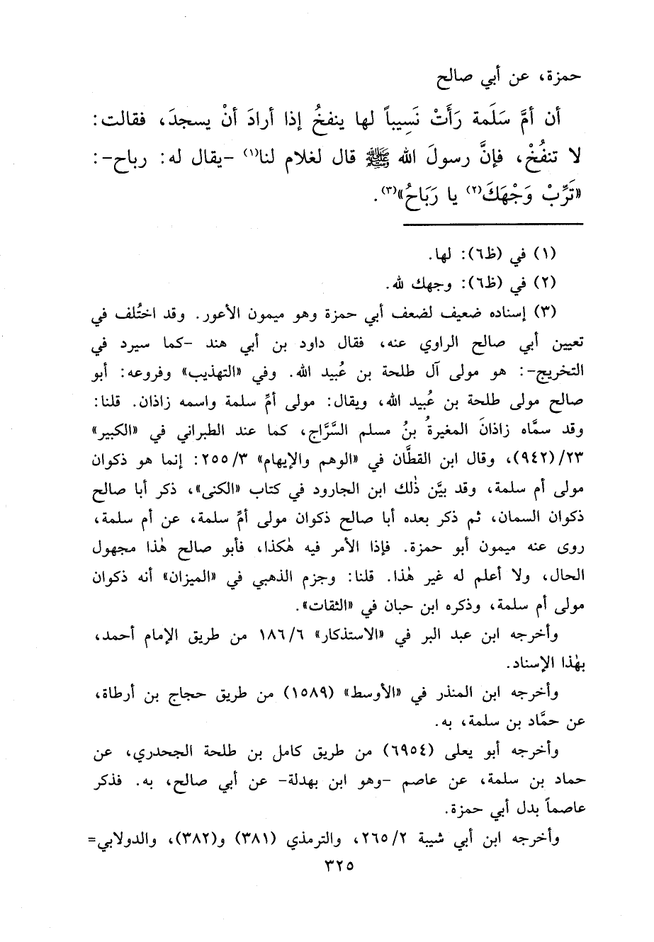 حَمْزَةَ، عَنْ أَبِي صَالِحٍ، أَنَّ أُمَّ سَلَمَةَ، رَأَتْ نَسِيبًا لَهَا يَنْفُخُ إِذَا أَرَادَ أَنْ يَسْجُدَ، فَقَالَتْ: لَا تَنْفُخْ، فَإِنَّ رَسُولَ اللهِ صَلَّى اللهُ عَلَيْهِ وَسَلَّمَ قَالَ لِغُلَامٍ لَنَا (١) يُقَالُ لَهُ: رَبَاحٌ: " تَرِّبْ وَجْهَكَ (٢) يَا رَبَاحُ " (٣)