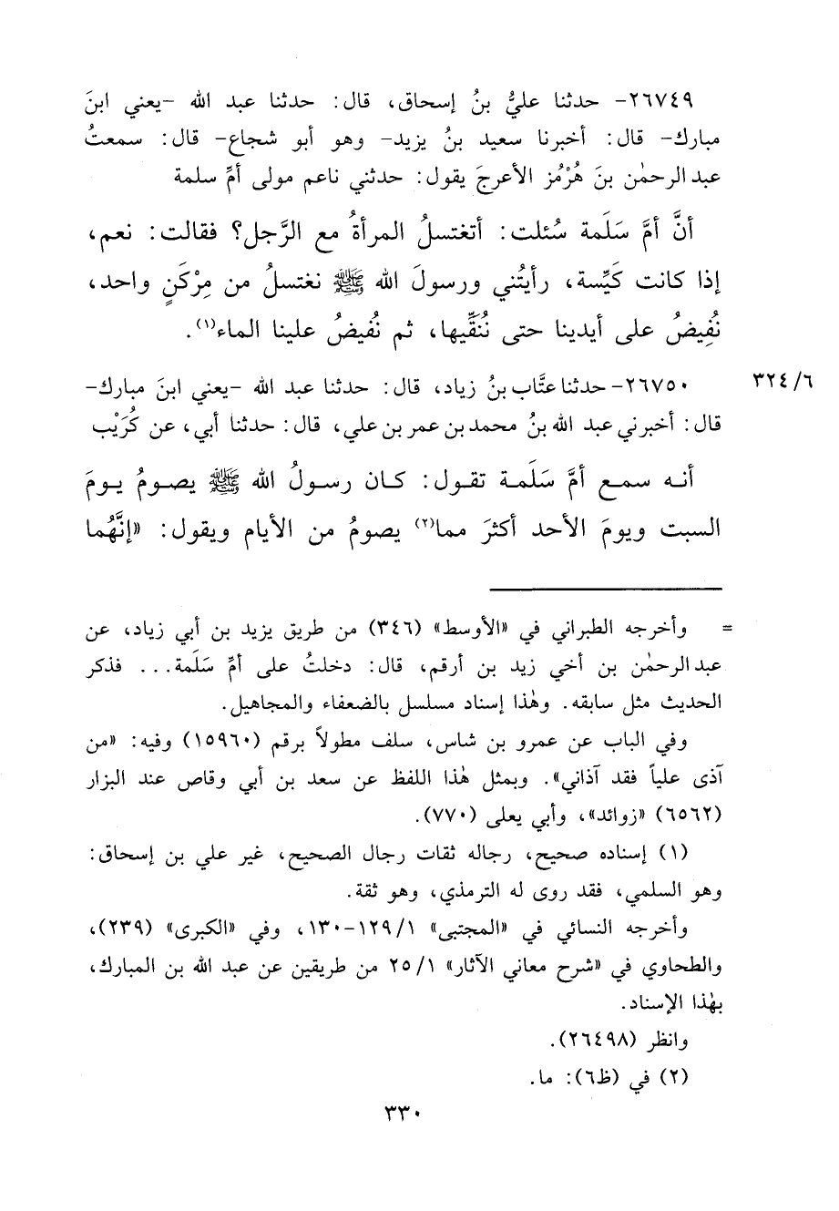 ٢٦٧٤٩ - حَدَّثَنَا عَلِيُّ بْنُ إِسْحَاقَ، قَالَ: حَدَّثَنَا عَبْدُ اللهِ يَعْنِي ابْنَ مُبَارَكٍ، قَالَ: أَخْبَرَنَا سَعِيدُ بْنُ يَزِيدَ وَهُوَ أَبُو شُجَاعٍ، قَالَ: سَمِعْتُ عَبْدَ الرَّحْمَنِ بْنَ هُرْمُزَ الْأَعْرَجَ، يَقُولُ: حَدَّثَنِي نَاعِمٌ، مَوْلَى أُمِّ سَلَمَةَ، أَنَّ أُمَّ سَلَمَةَ، سُئِلَتْ: أَتَغْتَسِلُ الْمَرْأَةُ مَعَ الرَّجُلِ؟ فَقَالَتْ: نَعَمْ، إِذَا كَانَتْ كَيِّسَةً " رَأَيْتُنِي وَرَسُولَ اللهِ صَلَّى اللهُ عَلَيْهِ وَسَلَّمَ نَغْتَسِلُ مِنْ مِرْكَنٍ وَاحِدٍ، نُفِيضُ عَلَى أَيْدِينَا حَتَّى نُنْقِيَهَا، ثُمَّ نُفِيضُ عَلَيْنَا الْمَاءَ " (١)