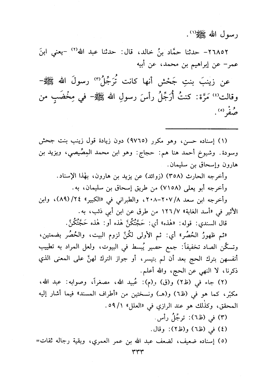 ٢٦٧٥٢ - حَدَّثَنَا حَمَّادُ بْنُ خَالِدٍ، قَالَ: حَدَّثَنَا عَبْدُ اللهِ (٢) يَعْنِي ابْنَ عُمَرَ، عَنْ إِبْرَاهِيمَ بْنِ مُحَمَّدٍ، عَنْ أَبِيهِ، عَنْ زَيْنَبَ بِنْتِ جَحْشٍ، أَنَّهَا كَانَتْ تُرَجِّلُ (٣) رَسُولَ اللهِ صَلَّى اللهُ عَلَيْهِ وَسَلَّمَ وَقَالَتْ (٤) مَرَّةً: " كُنْتُ أُرَجِّلُ رَأْسَ رَسُولِ اللهِ صَلَّى اللهُ عَلَيْهِ وَسَلَّمَ، فِي مِخْضَبٍ مِنْ صُفْرٍ " (٥)
