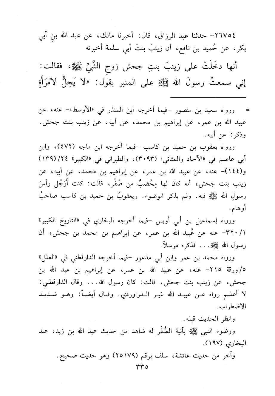 ٢٦٧٥٤ - حَدَّثَنَا عَبْدُ الرَّزَّاقِ، قَالَ: أَخْبَرَنَا مَالِكٌ، عَنْ عَبْدِ اللهِ بْنِ أَبِي بَكْرٍ، عَنْ حُمَيْدِ بْنِ نَافِعٍ، أَنَّ زَيْنَبَ بِنْتَ أَبِي سَلَمَةَ، أَخْبَرَتْهُ أَنَّهَا دَخَلَتْ عَلَى زَيْنَبَ بِنْتِ جَحْشٍ، زَوْجِ النَّبِيِّ صَلَّى اللهُ عَلَيْهِ وَسَلَّمَ، فَقَالَتْ: إِنِّي سَمِعْتُ رَسُولَ اللهِ صَلَّى اللهُ عَلَيْهِ وَسَلَّمَ عَلَى الْمِنْبَرِ يَقُولُ: " لَا يَحِلُّ لِامْرَأَةٍ