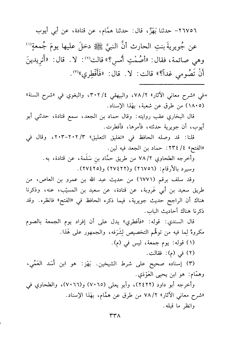 ٢٦٧٥٦ - حَدَّثَنَا بَهْزٌ، قَالَ: حَدَّثَنَا هَمَّامٌ، عَنْ قَتَادَةَ، عَنْ أَبِي أَيُّوبَ، عَنْ جُوَيْرِيَةَ بِنْتِ الْحَارِثِ، أَنَّ النَّبِيَّ صَلَّى اللهُ عَلَيْهِ وَسَلَّمَ دَخَلَ عَلَيْهَا يَوْمَ جُمُعَةٍ (١) وَهِيَ صَائِمَةٌ، فَقَالَ: " أَصُمْتِ أَمْسِ؟ " قَالَتْ (٢) : لَا. قَالَ: " أَتُرِيدِينَ أَنْ تَصُومِي غَدًا؟ " قَالَتْ: لَا. قَالَ: " فَأَفْطِرِي " (٣)