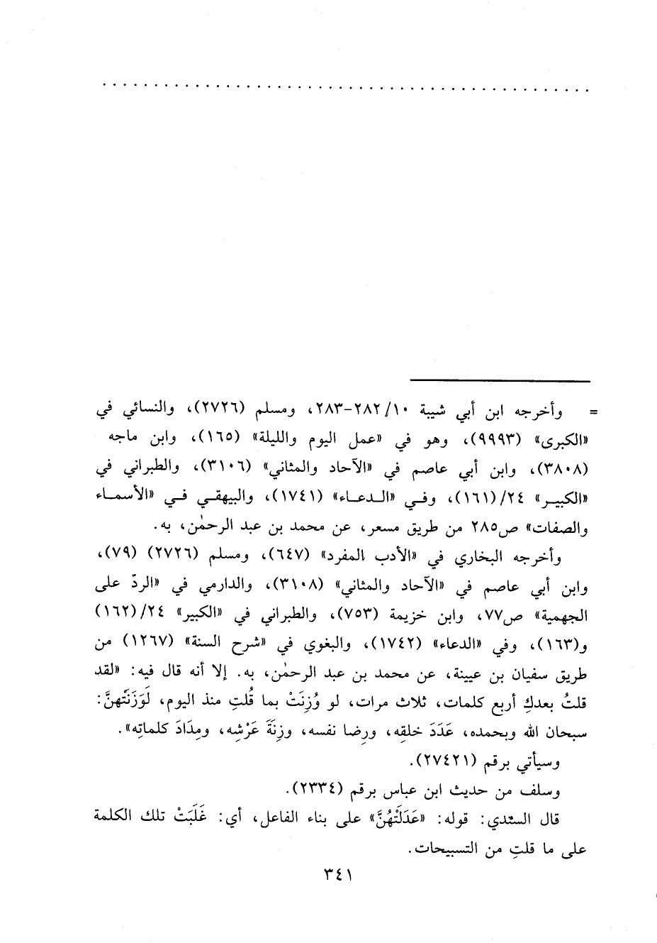 وأخرجه البخاري في "الأدب المفرد" (٦٤٧) ، ومسلم (٢٧٢٦) (٧٩) ، وابن أبي عاصم في "الآحاد والمثاني" (٣١٠٨) ، والدارمي في "الردّ على الجهمية" ص٧٧، وابن خزيمة (٧٥٣) ، والطبراني في "الكبير" ٢٤/ (١٦٢) و (١٦٣) ، وفي "الدعاء" (١٧٤٢) ، والبغوي في "شرح السنة" (١٢٦٧) من طريق سفيان بن عيينة، عن محمد بن عبد الرحمن، به. إلا أنه قال فيه: "لقد قلتُ بعدكِ أربع كلمات، ثلاث مرات، لو وُزِنَتْ بما قُلتِ منذ اليوم، لَوَزَنْتهنَّ: