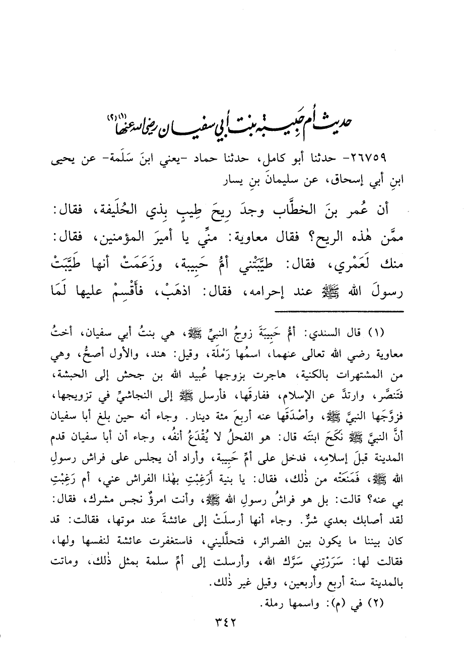 حَدِيثُ أُمِّ حَبِيبَةَ بِنْتِ أَبِي سُفْيَانَ رَضِيَ اللهُ عَنْهَا (١) (٢)