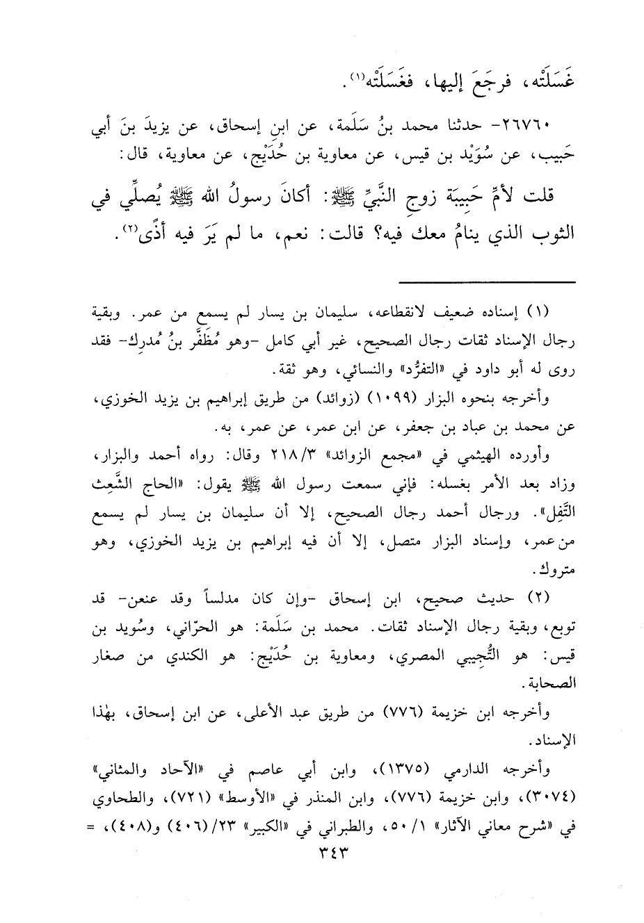 ٢٦٧٦٠ - حَدَّثَنَا مُحَمَّدُ بْنُ سَلَمَةَ، عَنِ ابْنِ إِسْحَاقَ، عَنِ يَزِيدَ بْنِ أَبِي حَبِيبٍ، عَنْ سُوَيْدِ بْنِ قَيْسٍ، عَنْ مُعَاوِيَةَ بْنِ حُدَيْجٍ، عَنْ مُعَاوِيَةَ، قَالَ: قُلْتُ لِأُمِّ حَبِيبَةَ، زَوْجِ النَّبِيِّ صَلَّى اللهُ عَلَيْهِ وَسَلَّمَ: أَكَانَ رَسُولُ اللهِ صَلَّى اللهُ عَلَيْهِ وَسَلَّمَ يُصَلِّي فِي الثَّوْبِ الَّذِي يَنَامُ مَعَكِ فِيهِ؟ قَالَتْ: " نَعَمْ، مَا لَمْ يَرَ فِيهِ أَذًى " (٢)