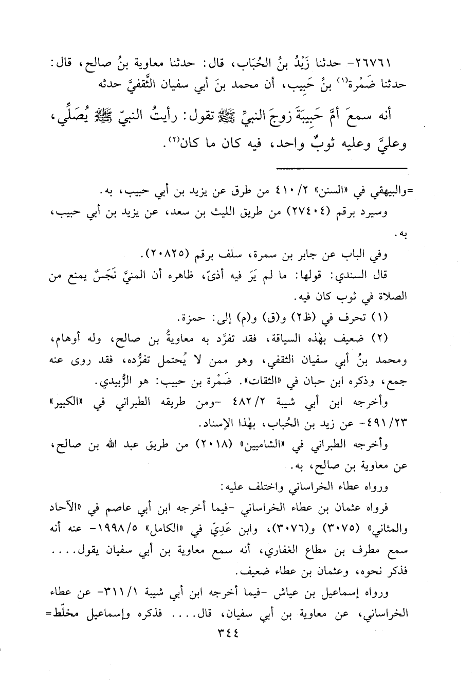 ٢٦٧٦١ - حَدَّثَنَا زَيْدُ بْنُ الْحُبَابِ، قَالَ: حَدَّثَنَا مُعَاوِيَةُ بْنُ صَالِحٍ، قَالَ: حَدَّثَنَا ضَمْرَةُ (١) بْنُ حَبِيبٍ، أَنَّ مُحَمَّدَ بْنَ أَبِي سُفْيَانَ الثَّقَفِيَّ، حَدَّثَهُ أَنَّهُ سَمِعَ أُمَّ حَبِيبَةَ، زَوْجَ النَّبِيِّ صَلَّى اللهُ عَلَيْهِ وَسَلَّمَ تَقُولُ: " رَأَيْتُ النَّبِيَّ صَلَّى اللهُ عَلَيْهِ وَسَلَّمَ يُصَلِّي، وَعَلَيَّ وَعَلَيْهِ ثَوْبٌ وَاحِدٌ، فِيهِ كَانَ مَا كَانَ " (٢)