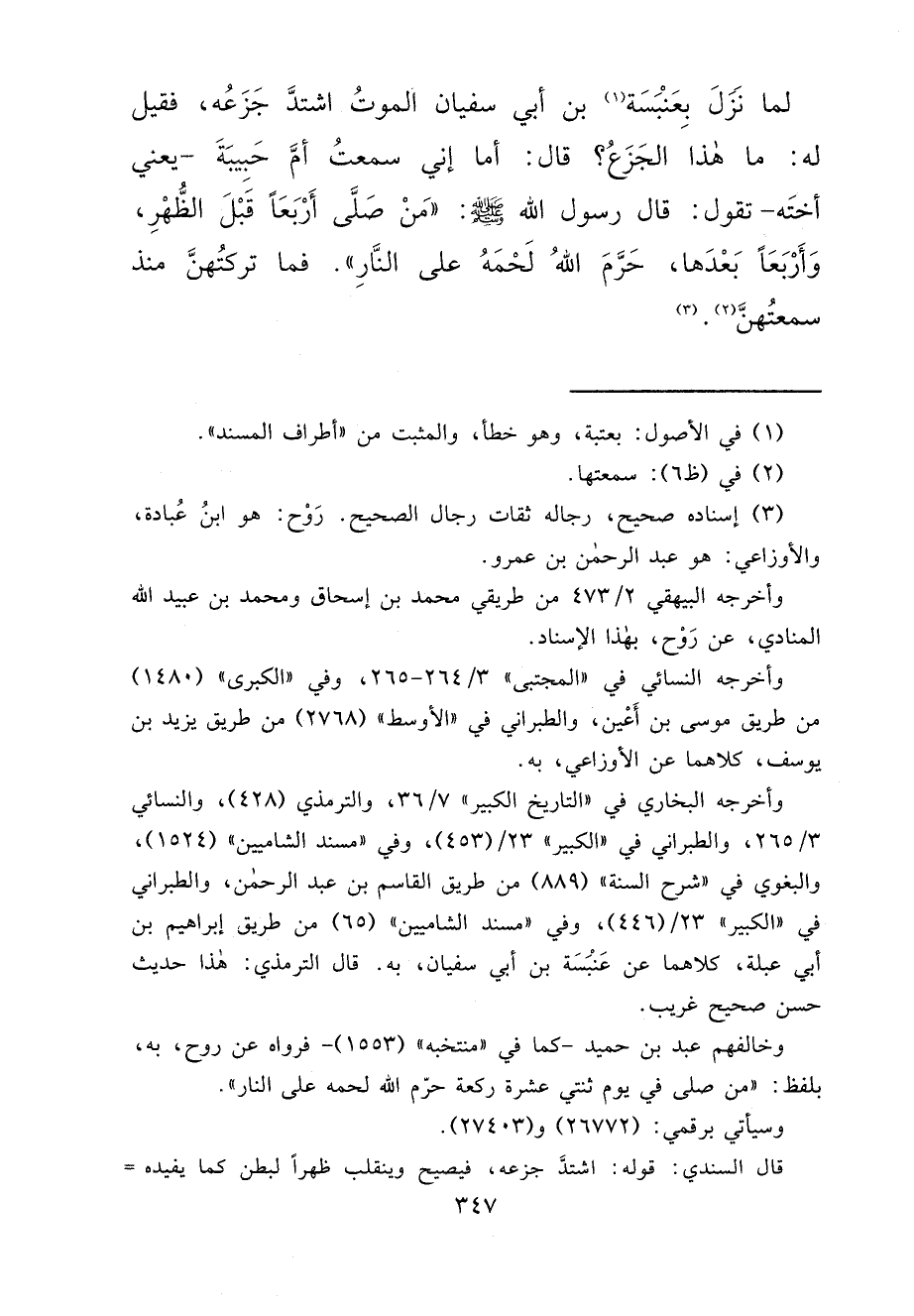 لَمَّا نَزَلَ بِعَنْبَسَةَ (١) بْنَ أَبِي سُفْيَانَ، الْمَوْتُ اشْتَدَّ جَزَعُهُ، فَقِيلَ لَهُ: مَا هَذَا الْجَزَعُ؟ قَالَ: أَمَا إِنِّي سَمِعْتُ أُمَّ حَبِيبَةَ، يَعْنِي أُخْتَهُ، تَقُولُ: قَالَ رَسُولُ اللهِ صَلَّى اللهُ عَلَيْهِ وَسَلَّمَ: " مَنْ صَلَّى أَرْبَعًا قَبْلَ الظُّهْرِ، وَأَرْبَعًا بَعْدَهَا، حَرَّمَ اللهُ لَحْمَهُ عَلَى النَّارِ ". فَمَا تَرَكْتُهُنَّ مُنْذُ سَمِعْتُهُنَّ (٢) (٣)