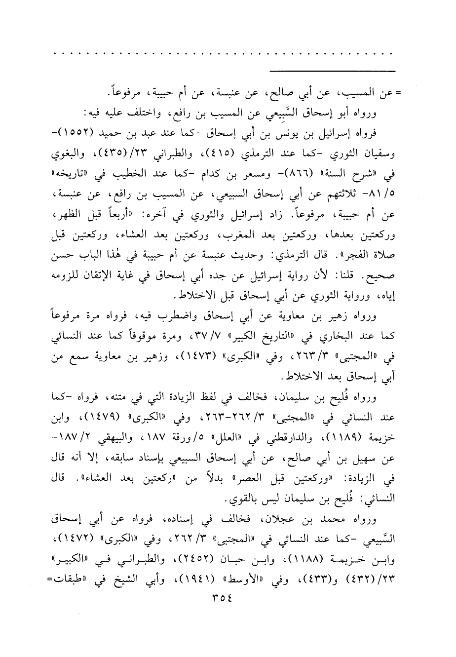 فرواه إسرائيل بن يونس بن أبي إسحاق - كما عند عبد بن حميد (١٥٥٢) - وسفيان الثوري - كما عند الترمذي (٤١٥) ، والطبراني ٢٣/ (٤٣٥) ، والبغوي في "شرح السنة" (٨٦٦) - ومسعر بن كدام - كما عند الخطيب في "تاريخه" ٥/٨١ - ثلاثتهم عن أبي إسحاق السبيعي، عن المسيب بن رافع، عن عنبسة، عن أم حبيبة، مرفوعاً. زاد إسرائيل والثوري في آخره: "أربعاً قبل الظهر،