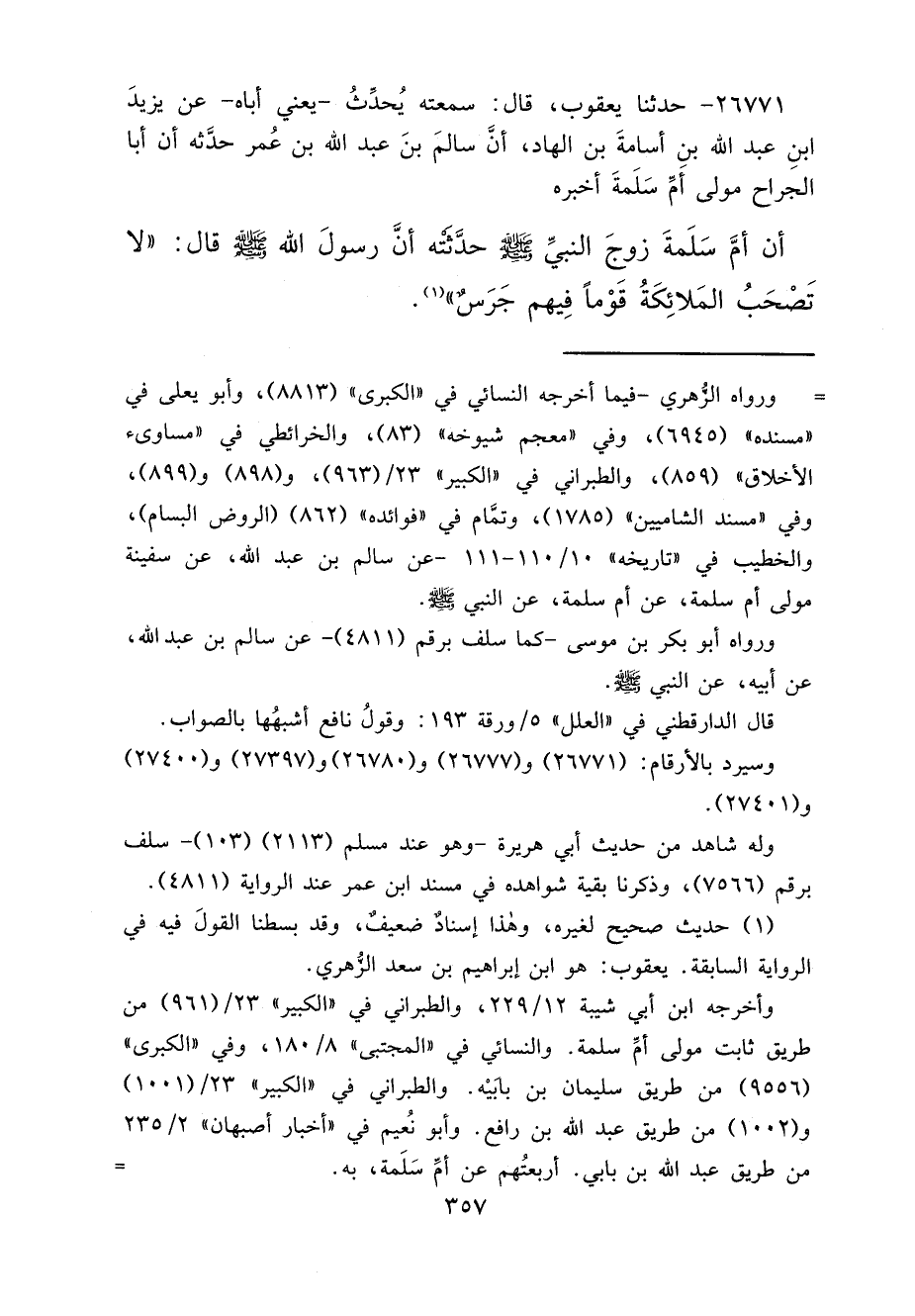 ٢٦٧٧١ - حَدَّثَنَا يَعْقُوبُ، قَالَ: سَمِعْتُهُ يُحَدِّثُ يَعْنِي أَبَاهُ، عَنْ يَزِيدَ بْنِ عَبْدِ اللهِ بْنِ أُسَامَةَ بْنِ الْهَادِ، أَنَّ سَالِمَ بْنَ عَبْدِ اللهِ بْنِ عُمَرَ، حَدَّثَهُ أَنَّ أَبَا الْجَرَّاحِ، مَوْلَى أُمِّ سَلَمَةَ، أَخْبَرَهُ أَنَّ أُمَّ سَلَمَةَ، زَوْجَ النَّبِيِّ صَلَّى اللهُ عَلَيْهِ وَسَلَّمَ حَدَّثَتْهُ أَنَّ رَسُولَ اللهِ صَلَّى اللهُ عَلَيْهِ وَسَلَّمَ قَالَ: " لَا تَصْحَبُ الْمَلَائِكَةُ قَوْمًا فِيهِمْ جَرَسٌ " (١)