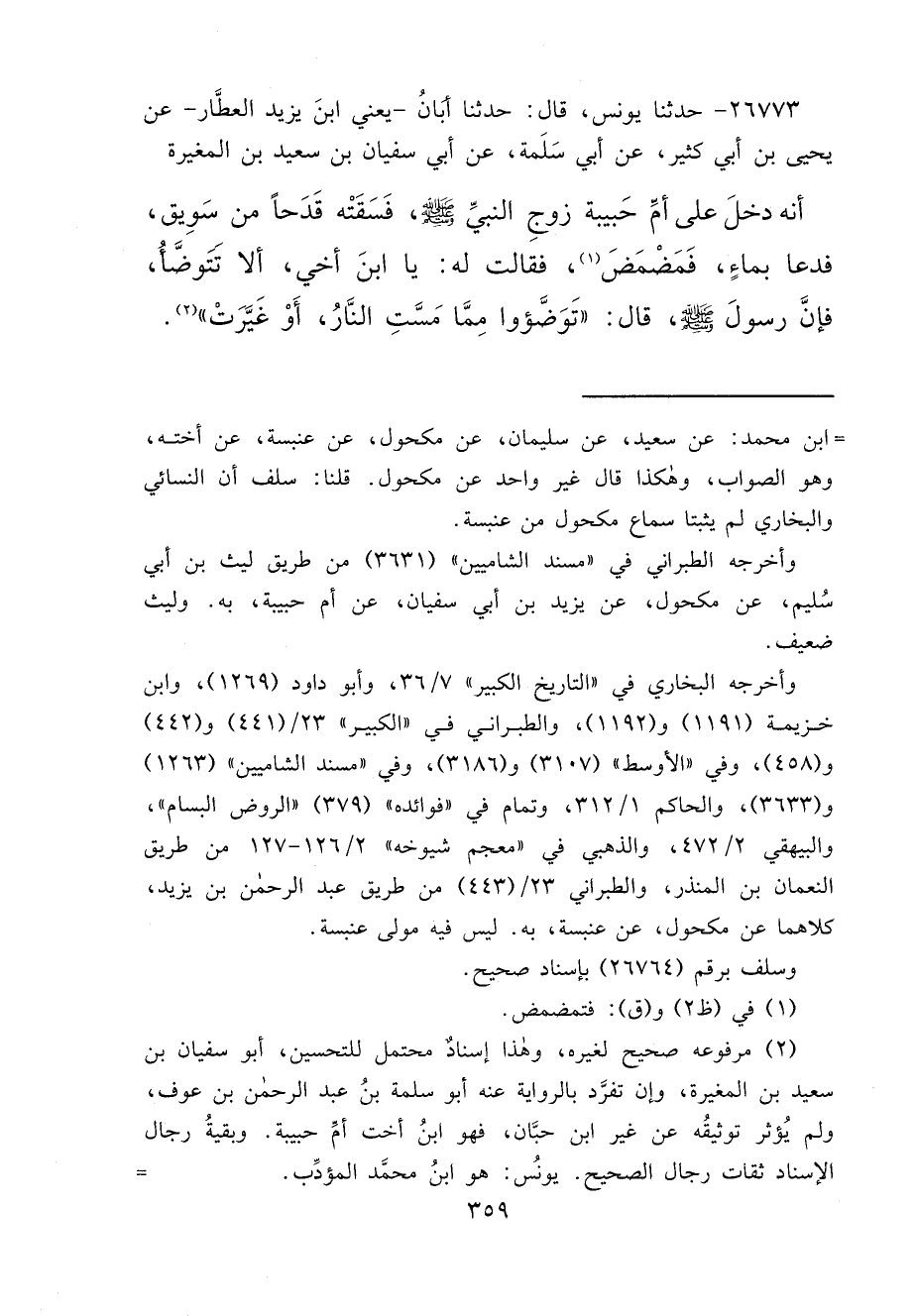 ٢٦٧٧٣ - حَدَّثَنَا يُونُسُ، قَالَ: حَدَّثَنَا أَبَانُ يَعْنِي ابْنَ يَزِيدَ الْعَطَّارَ، عَنْ يَحْيَى بْنِ أَبِي كَثِيرٍ، عَنْ أَبِي سَلَمَةَ، عَنْ أَبِي سُفْيَانَ بْنِ سَعِيدِ بْنِ الْمُغِيرَةِ، أَنَّهُ دَخَلَ عَلَى أُمِّ حَبِيبَةَ، زَوْجِ النَّبِيِّ صَلَّى اللهُ عَلَيْهِ وَسَلَّمَ، فَسَقَتْهُ قَدَحًا مِنْ سَوِيقٍ، فَدَعَا بِمَاءٍ، فَمَضْمَضَ (١) ، فَقَالَتْ لَهُ: يَا ابْنَ أَخِي، أَلَا تَتَوَضَّأُ، فَإِنَّ رَسُولَ اللهِ صَلَّى اللهُ عَلَيْهِ وَسَلَّمَ، قَالَ: " تَوَضَّئُوا مِمَّا مَسَّتِ النَّارُ، أَوْ غَيَّرَتْ " (٢)