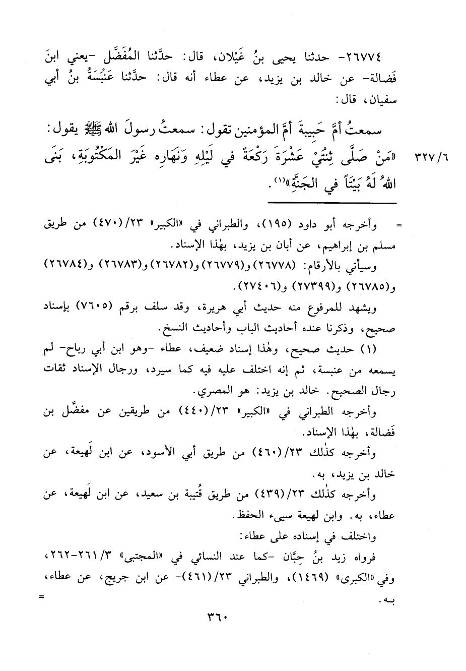 ٢٦٧٧٤ - حَدَّثَنَا يَحْيَى بْنُ غَيْلَانَ، قَالَ: حَدَّثَنَا الْمُفَضَّلُ يَعْنِي ابْنَ فَضَالَةَ، عَنْ خَالِدِ بْنِ يَزِيدَ، عَنْ عَطَاءٍ، أَنَّهُ قَالَ: حَدَّثَنَا عَنْبَسَةُ بْنُ أَبِي سُفْيَانَ، قَالَ: سَمِعْتُ أُمَّ حَبِيبَةَ، أُمَّ الْمُؤْمِنِينَ تَقُولُ: سَمِعْتُ رَسُولَ اللهِ صَلَّى اللهُ عَلَيْهِ وَسَلَّمَ يَقُولُ: " مَنْ صَلَّى ثِنْتَيْ عَشْرَةَ رَكْعَةً فِي لَيْلِهِ وَنَهَارِهِ غَيْرَ الْمَكْتُوبَةِ، بَنَى اللهُ لَهُ بَيْتًا فِي الْجَنَّةِ " (١)