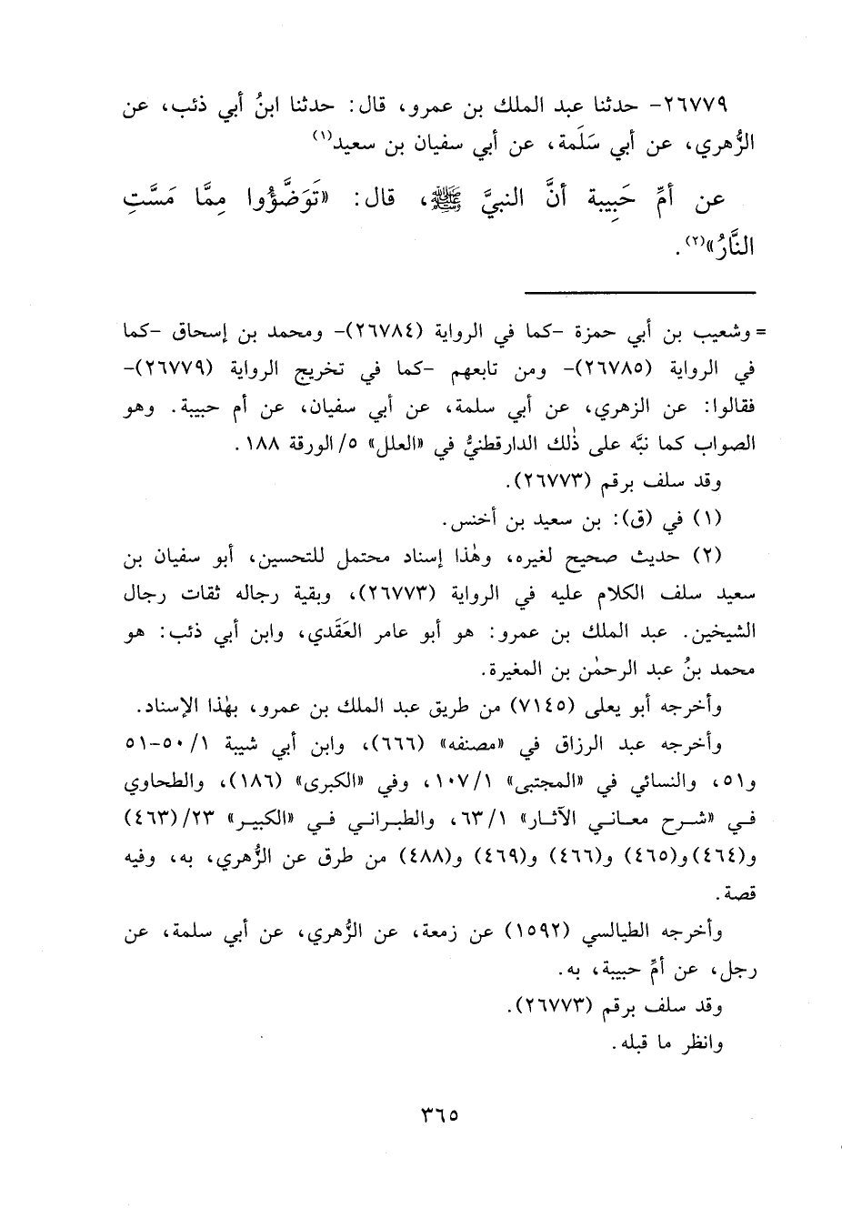 ٢٦٧٧٩ - حَدَّثَنَا عَبْدُ الْمَلِكِ بْنُ عَمْرٍو، قَالَ: حَدَّثَنَا ابْنُ أَبِي ذِئْبٍ، عَنِ الزُّهْرِيِّ، عَنْ أَبِي سَلَمَةَ، عَنْ أَبِي سُفْيَانَ بْنِ سَعِيدٍ (١) ، عَنْ أُمِّ حَبِيبَةَ، أَنَّ النَّبِيَّ صَلَّى اللهُ عَلَيْهِ وَسَلَّمَ قَالَ: " تَوَضَّئُوا مِمَّا مَسَّتِ النَّارُ " (٢)