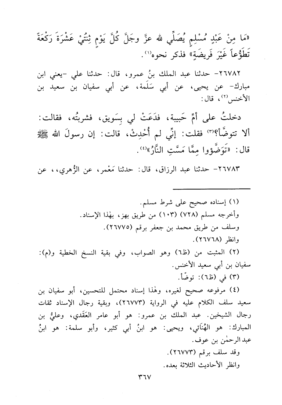 ٢٦٧٨٢ - حَدَّثَنَا عَبْدُ الْمَلِكِ بْنُ عَمْرٍو، قَالَ: حَدَّثَنَا عَلِيٌّ يَعْنِي ابْنَ مُبَارَكٍ، عَنْ يَحْيَى، عَنْ أَبِي سَلَمَةَ، عَنْ أَبِي سُفْيَانَ بْنِ سَعِيدٍ بْنِ الْأَخْنَسِ (٢) ، قَالَ: دَخَلْتُ عَلَى أُمِّ حَبِيبَةَ، فَدَعَتْ لِي بِسَوِيقٍ، فَشَرِبْتُهُ، فَقَالَتْ: أَلَا تَتَوَضَّأُ؟ (٣) فَقُلْتُ: إِنِّي لَمْ أُحْدِثْ، قَالَتْ: إِنَّ رَسُولَ اللهِ صَلَّى اللهُ عَلَيْهِ وَسَلَّمَ قَالَ: " تَوَضَّئُوا مِمَّا مَسَّتِ النَّارُ " (٤)