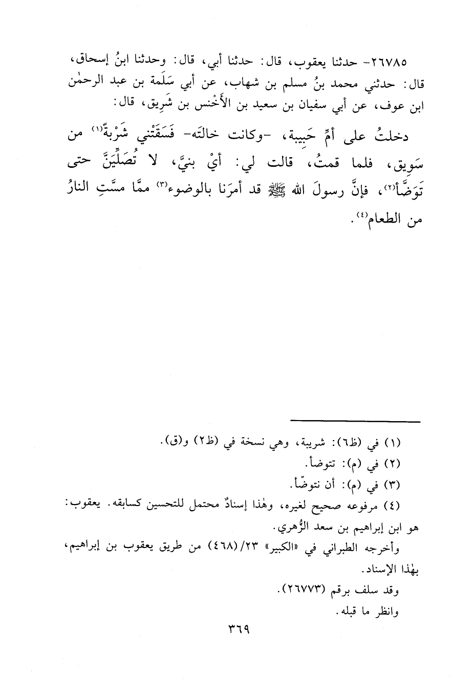 ٢٦٧٨٥ - حَدَّثَنَا يَعْقُوبُ، قَالَ: حَدَّثَنَا أَبِي، قَالَ: وَحَدَّثَنَا ابْنُ إِسْحَاقَ، قَالَ: حَدَّثَنِي مُحَمَّدُ بْنُ مُسْلِمِ بْنِ شِهَابٍ، عَنْ أَبِي سَلَمَةَ بْنِ عَبْدِ الرَّحْمَنِ بْنِ عَوْفٍ، عَنْ أَبِي سُفْيَانَ بْنِ سَعِيدِ بْنِ الْأَخْنَسِ بْنِ شَرِيقٍ، قَالَ: دَخَلْتُ عَلَى أُمِّ حَبِيبَةَ، وَكَانَتْ خَالَتَهُ، فَسَقَتْنِي شَرْبَةً (١) مِنْ سَوِيقٍ، فَلَمَّا قُمْتُ، قَالَتْ لِي: أَيْ بُنَيَّ، لَا تُصَلِّيَنَّ حَتَّى تَوَضَّأَ " (٢) فَإِنَّ رَسُولَ اللهِ صَلَّى اللهُ عَلَيْهِ وَسَلَّمَ قَدْ أَمَرَنَا بِالْوُضُوءِ (٣) مِمَّا مَسَّتِ النَّارُ مِنَ الطَّعَامِ " (٤)