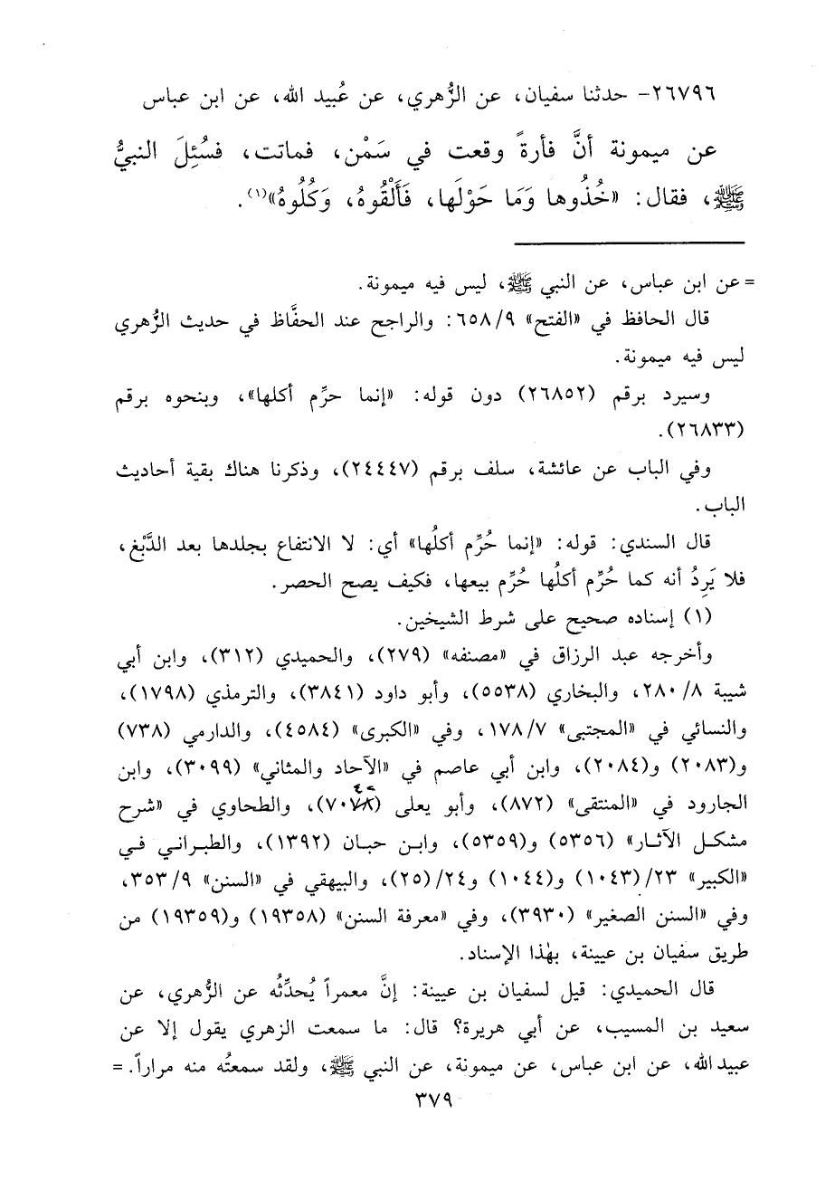 ٢٦٧٩٦ - حَدَّثَنَا سُفْيَانُ، عَنِ الزُّهْرِيِّ، عَنْ عُبَيْدِ اللهِ، عَنِ ابْنِ عَبَّاسٍ، عَنْ مَيْمُونَةَ، أَنَّ فَأْرَةً وَقَعَتْ فِي سَمْنٍ، فَمَاتَتْ، فَسُئِلَ النَّبِيُّ صَلَّى اللهُ عَلَيْهِ وَسَلَّمَ قَالَ: " خُذُوهَا وَمَا حَوْلَهَا، فَأَلْقُوهُ، وَكُلُوهُ " (١)