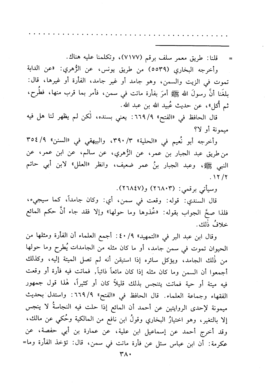 وقال ابن عبد البر في "التمهيد" ٩/٤٠: أجمع العلماء أن الفأرة ومثلها من الحيوان تموت في سمن جامد، أو ما كان مثله من الجامدات يُطرح وما حولها من ذلك الجامد، ويؤكل سائره إذا استيقن أنه لم تصل الميتة إليه، وكذلك أجمعوا أن السمن وما كان مثله إذا كان مائعاً ذائباً، فماتت فيه فأرة أو وقعت فيه ميتة أو حية فماتت يتنجس بذلك فليلاً كان أو كثيراً، هذا قول جمهور الفقهاء وجماعة العلماء. قال الحافظ في "الفتح" ٩/٦٦٩: واستدل بحديث ميمونة لإحدى الروايتين عن أحمد أن المائع إذا حلت فيه النجاسةُ لا ينجس إلا بالتغير، وهو اختيارُ البخاري وقولُ ابن نافع من المالكية وحُكي عن مالك، وقد أخرج أحمد عن إسماعيل ابن علية، عن عمارة بن أبي حفصة، عن عكرمة: أن ابن عباس سئل عن فأرة ماتت في سمن، قال: تؤخذ الفأرة وما=
