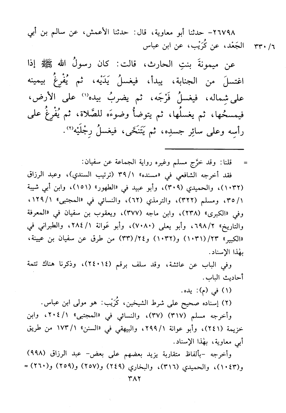 ٢٦٧٩٨ - حَدَّثَنَا أَبُو مُعَاوِيَةَ، قَالَ: حَدَّثَنَا الْأَعْمَشُ، عَنْ سَالِمِ بْنِ أَبِي الْجَعْدِ، عَنْ كُرَيْبٍ، عَنِ ابْنِ عَبَّاسٍ، عَنْ مَيْمُونَةَ بِنْتِ الْحَارِثِ، قَالَتْ: " كَانَ رَسُولُ اللهِ صَلَّى اللهُ عَلَيْهِ وَسَلَّمَ إِذَا اغْتَسَلَ مِنَ الْجَنَابَةِ، يَبْدَأُ، فَيَغْسِلُ يَدَيْهِ، ثُمَّ يُفْرِغُ بِيَمِينِهِ عَلَى شِمَالِهِ، فَيَغْسِلُ فَرْجَهُ، ثُمَّ يَضْرِبُ بِيَدِهِ (١) عَلَى الْأَرْضِ، فَيَمْسَحُهَا، ثُمَّ يَغْسِلُهَا، ثُمَّ يَتَوَضَّأُ وُضُوءَهُ لِلصَّلَاةِ، ثُمَّ يُفْرِغُ عَلَى رَأْسِهِ وَعَلَى سَائِرِ جَسَدِهِ، ثُمَّ يَتَنَحَّى، فَيَغْسِلُ رِجْلَيْهِ " (٢)